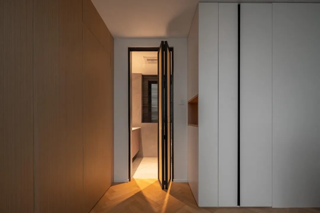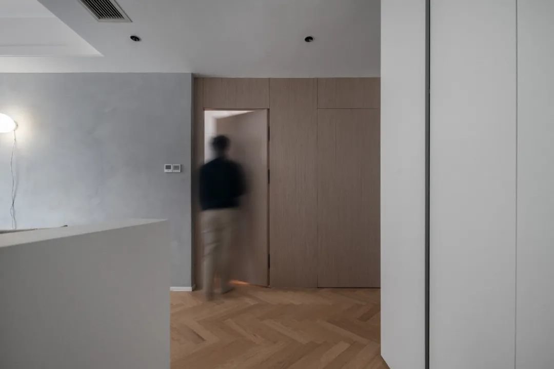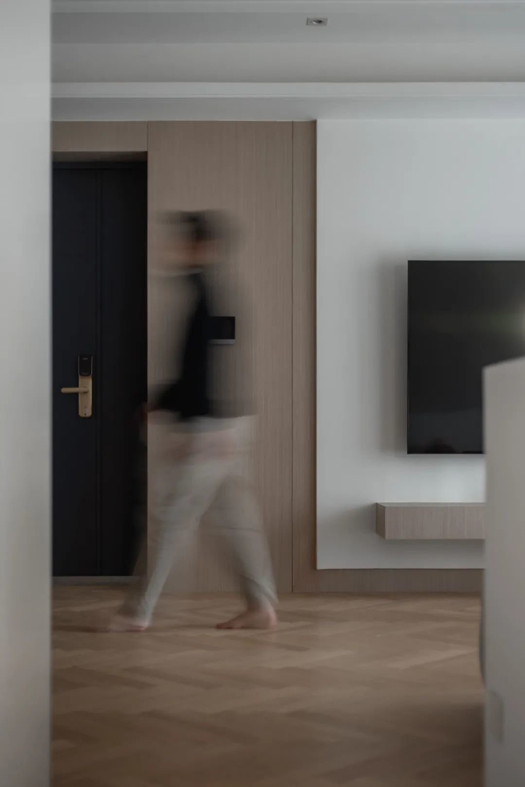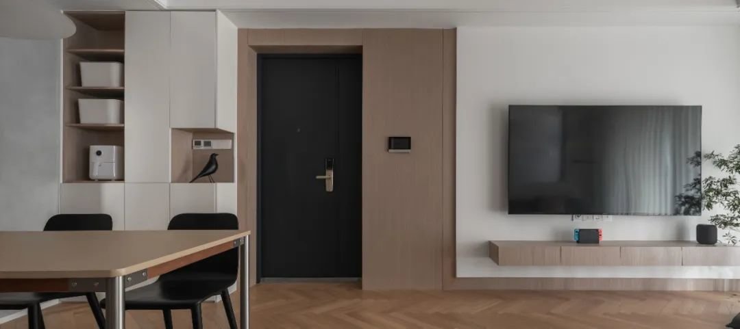 通往两个卧室的门与墙面木饰面整合做隐形门,平时关上让空间更简洁。
