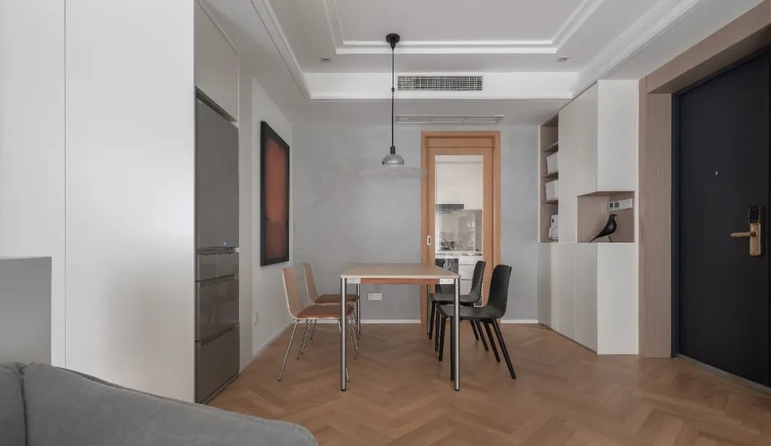 利用冰箱柜向左延伸餐厅空间,餐厅可放置1.6m长的条形餐桌,满足家人朋友聚会。