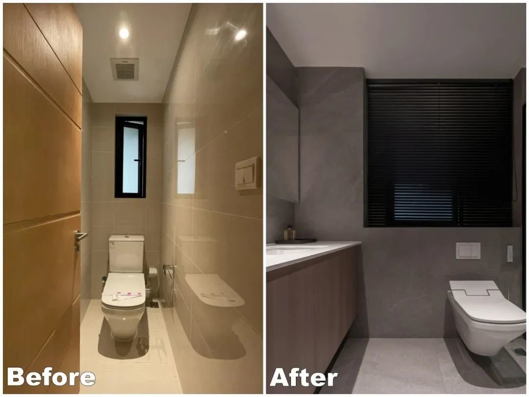 拆除马桶间与卫生间之间的隔墙增大卫生间面积,增加合理性及使用舒适度。因卫生间不是同层排水,我们将马桶改到靠窗的污水管一侧做墙排马桶。同时马桶矮墙上方可增加出一排收纳台面放置物品。