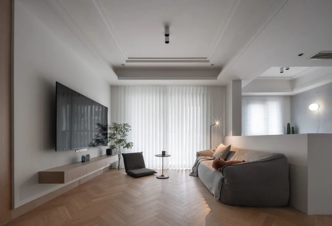 空间打通后沙发及电视机位做了对调,同时把冰箱外置嵌入进过道储物柜增强整体性。