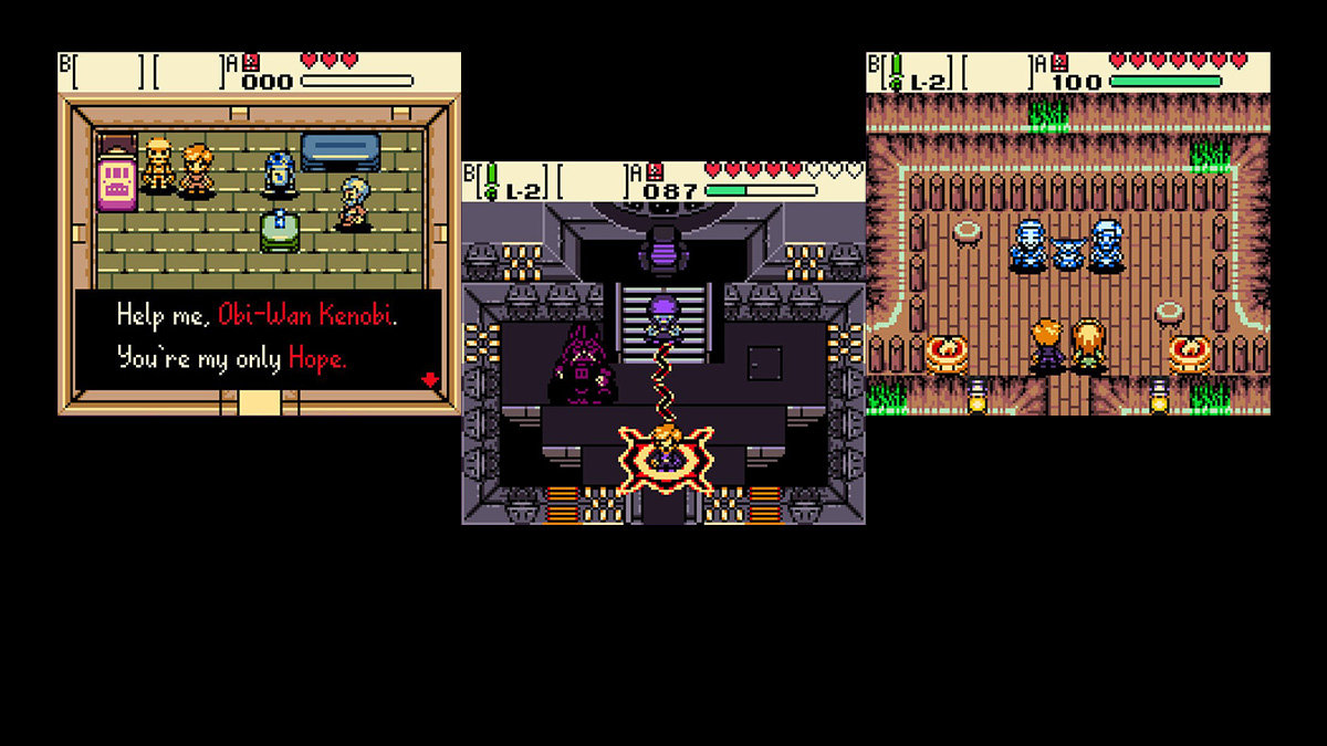显而易见,《卢克的觉醒》的创作灵感来源自任天堂经典GBC游戏《塞尔达传说:织梦岛》,作者Shoehead是个独立游戏开发者和像素艺术者,他用《织梦岛》的画风绘制了《星球大战》的正传三部曲多个经典场景,包括卢克和“本”一起看莱娅公主的求救全息视频,卢克直面自己的father达斯维达,还有卢克最后结局看到三位绝地英灵等在内的9个场景,不过就没有经典的断手那一幕了...