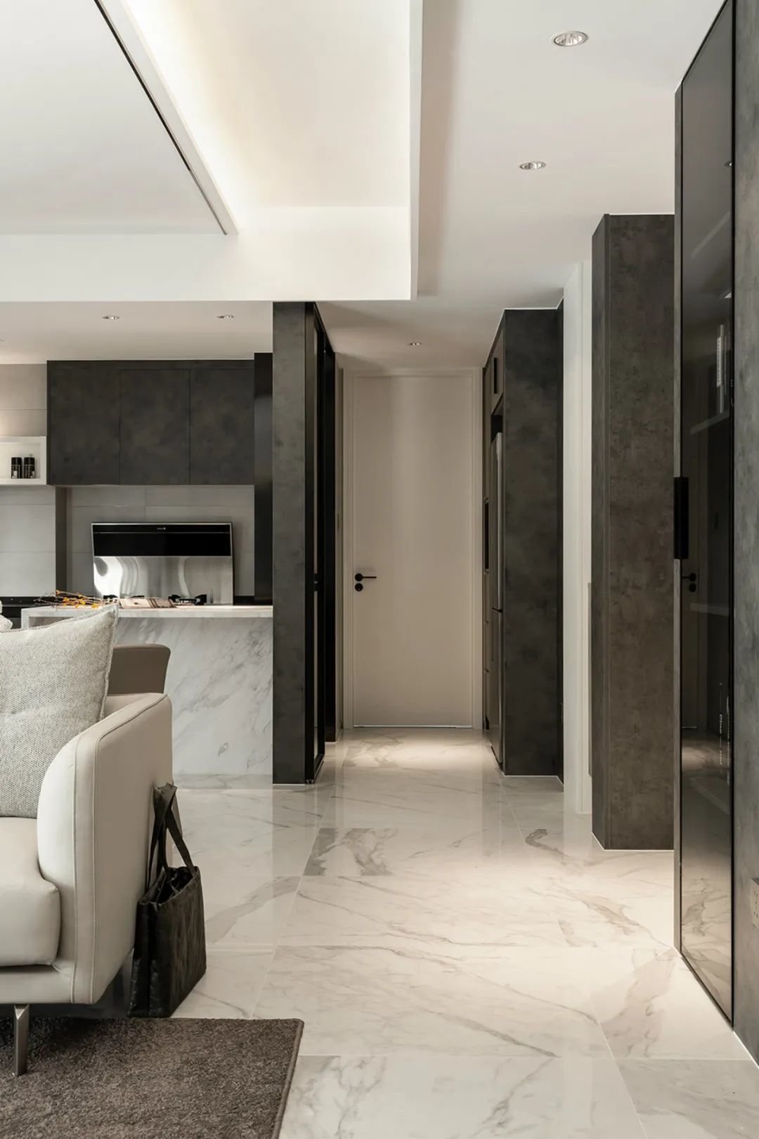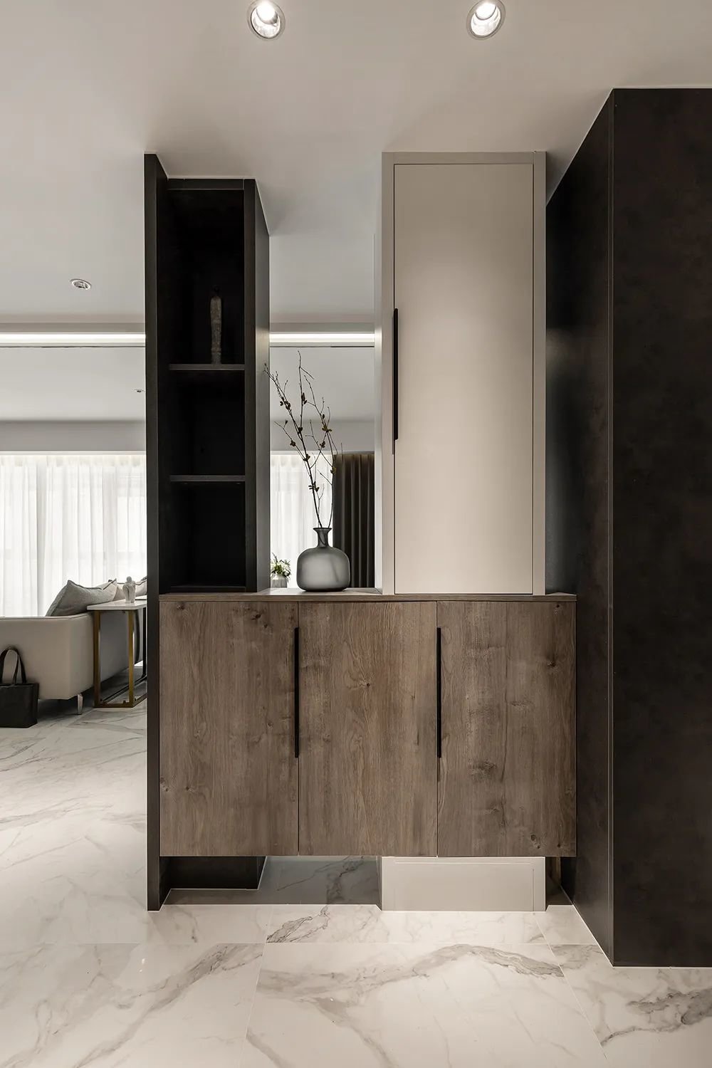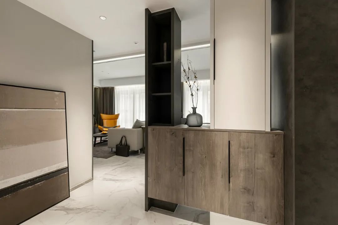 ▲从客厅望向玄关,可以看到一个装饰精美的鞋柜,上面摆放着一束盆栽花卉,为整个空间增添了一份自然的生气。这束盆栽花卉不仅仅是一个简单的装饰物,它的存在让人感受到了主人对生活的热爱和对生命的敬畏。