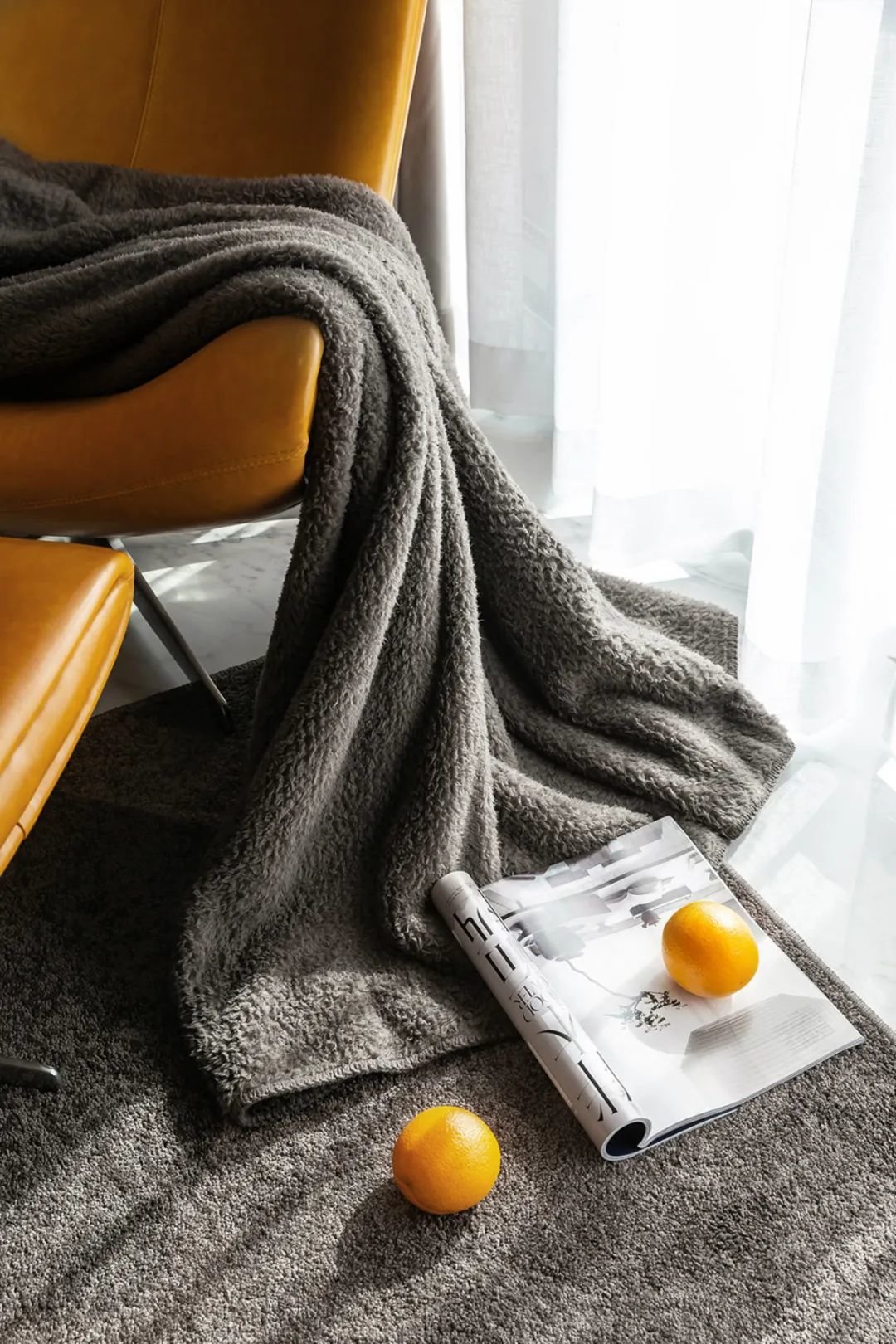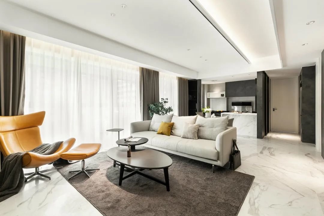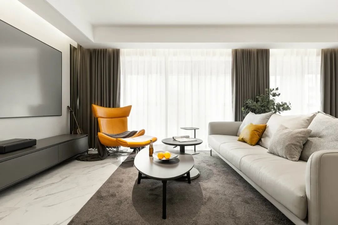 ▲通过丰富多彩的软装搭配,包括深咖色的窗帘和地毯、鲜艳的橙色单人沙发以及绿色植物的点缀,这个空间的层次感得到了进一步的提升。色彩的丰富性不仅让整个空间更加生动有趣,还能让人们感受到它的活力和热情。
