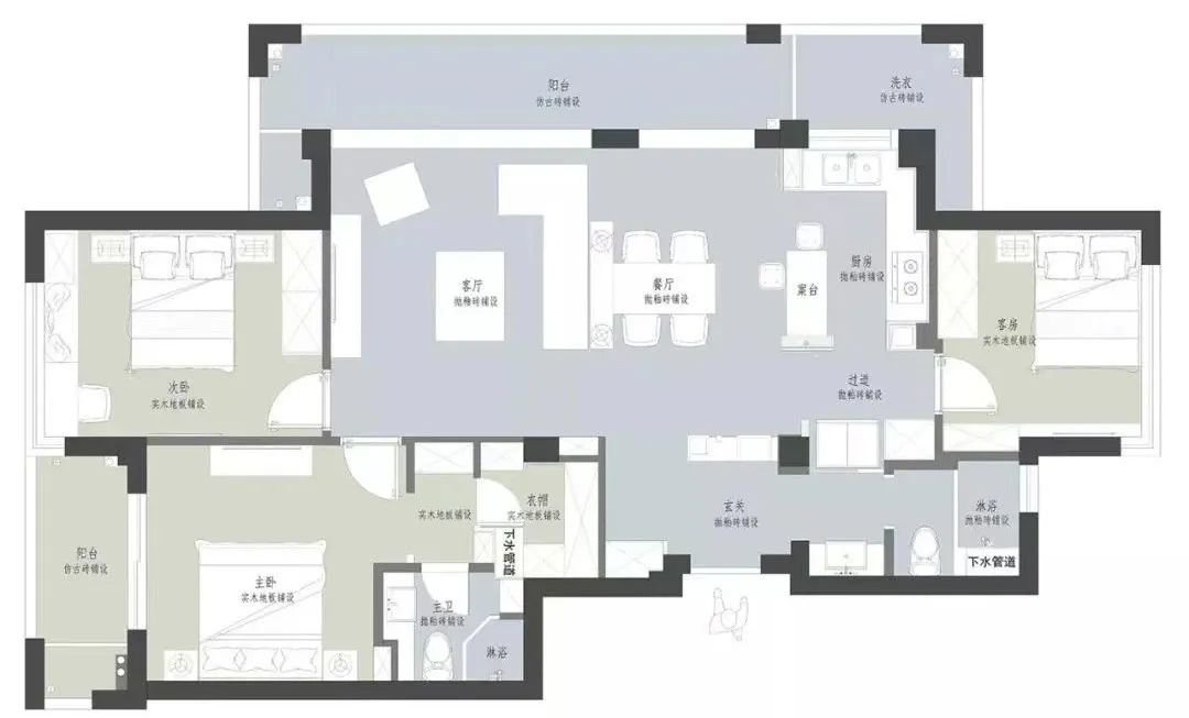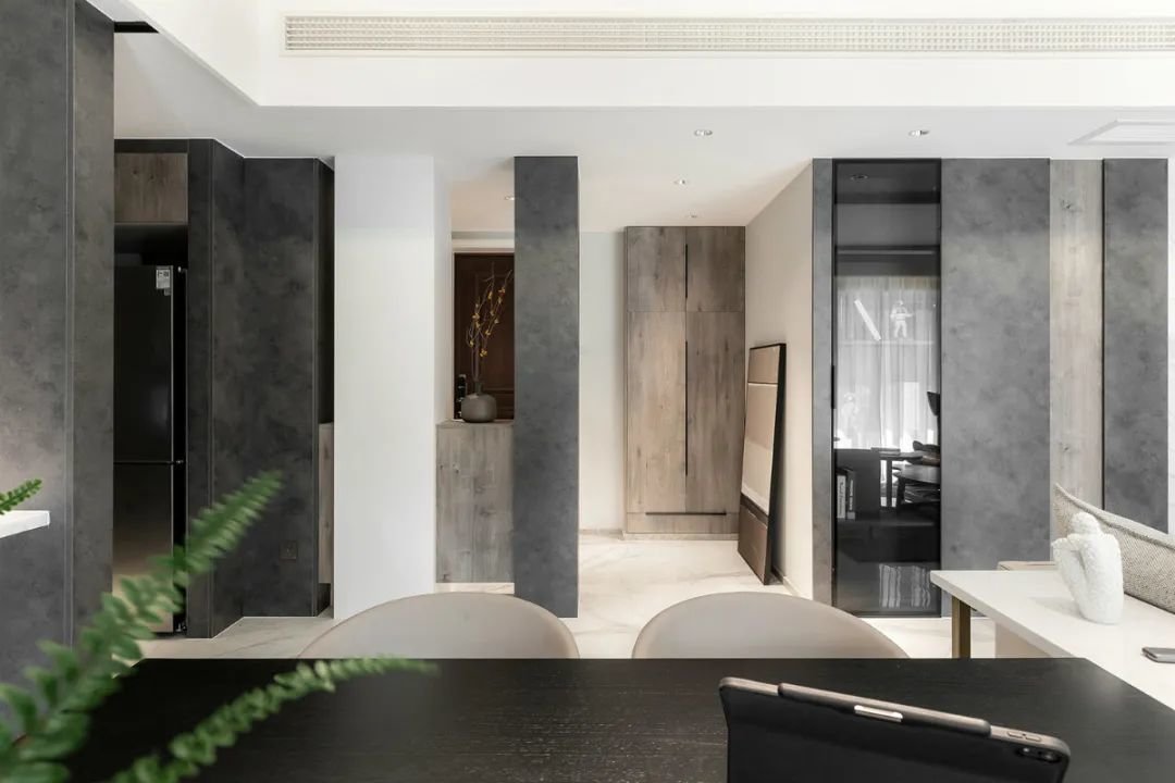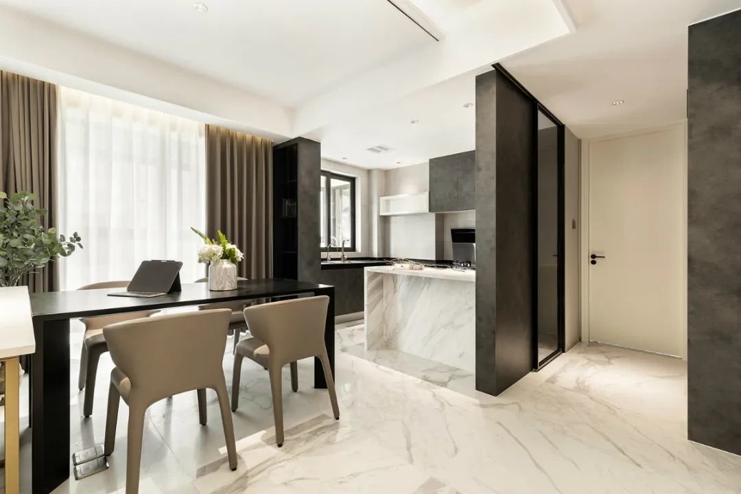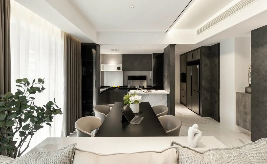 这套128㎡三房两厅的设计,采用了客厅、餐厅和厨房融为一体的布局,使整个空间更加开阔明亮。而在材料的选择方面,设计师选用了云朵拉灰、爵士白、页岩板、胡桃木和黑色拉丝不锈钢等多种材料,通过丰富的色彩搭配,打造出现代简约的居室氛围。
