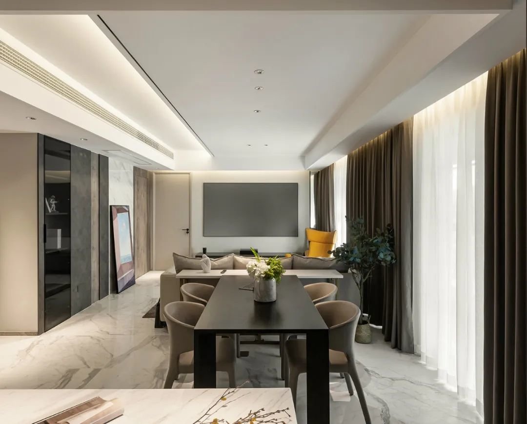 ▲从餐厅的角度看过去,客人可以尽情欣赏客厅的美景,视野十分开阔。透过白纱窗帘,阳光轻柔地洒在室内,让整个空间都显得温馨而舒适。