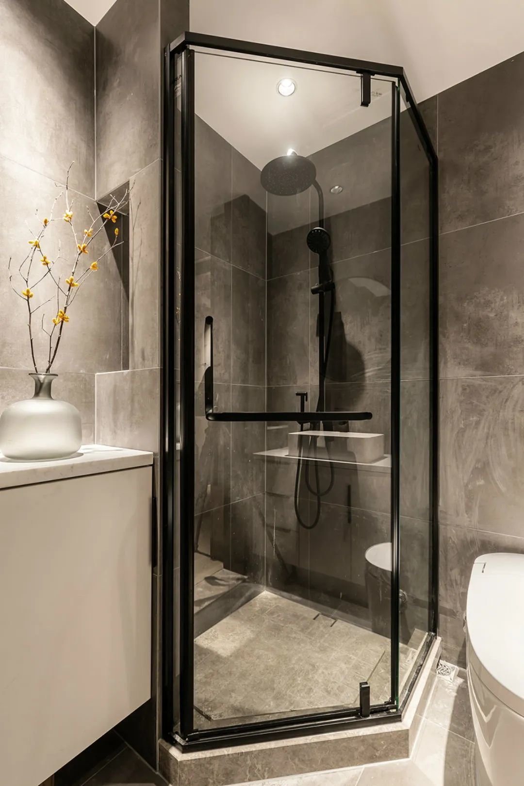 ▲因卫生间面积有限,所以采用钻石型的淋浴房,其外形呈现出钻石的形状,给人以美感和时尚感。不仅可以为浴室增添现代感,还能有效地节省空间。