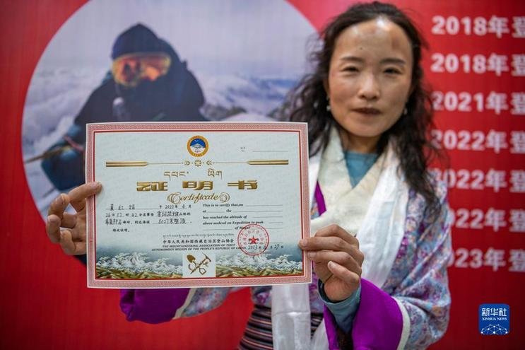 4月29日,董红娟向记者展示希夏邦马峰登顶证书。新华社记者孙非摄