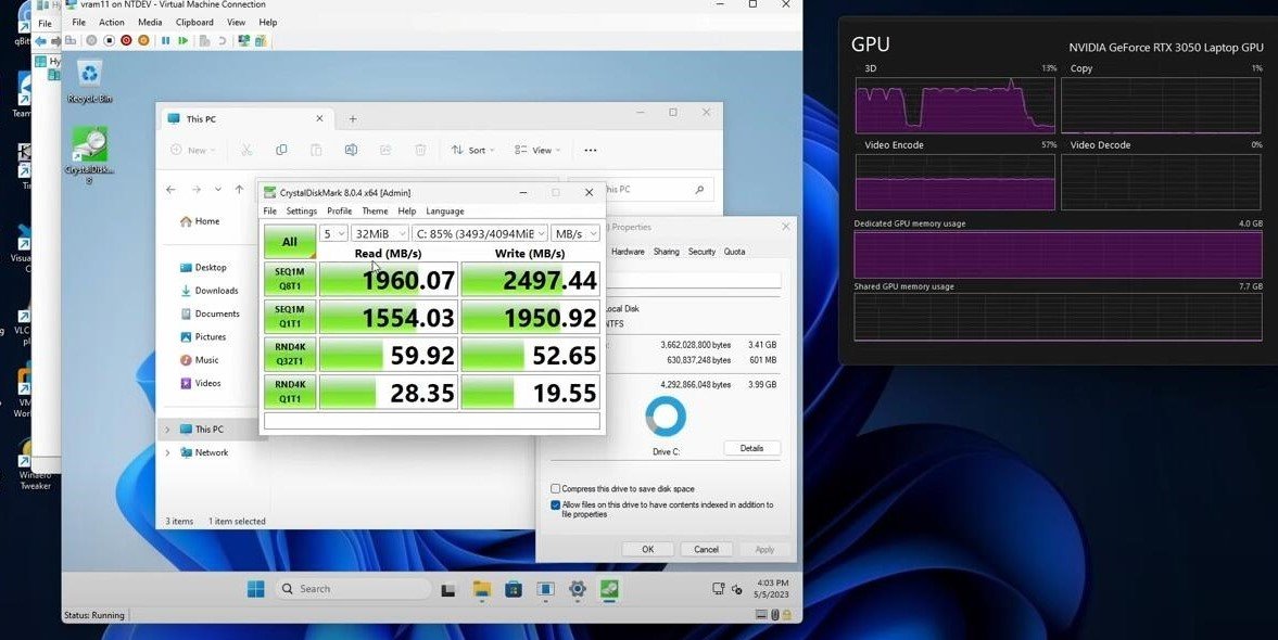 NTDEV通过GpuRamDrive软件使用显存创建了一个大小为3550MB的内存磁盘,并通过虚拟机将系统安装在显存中。安装好系统后,NTDEV还运行了CrystalDiskMark测试,顺序读取速度为1960MB/s,顺序写入速度为2497MB/s,性能不及高端PCIe 3.0 x4 M.2固态硬盘。