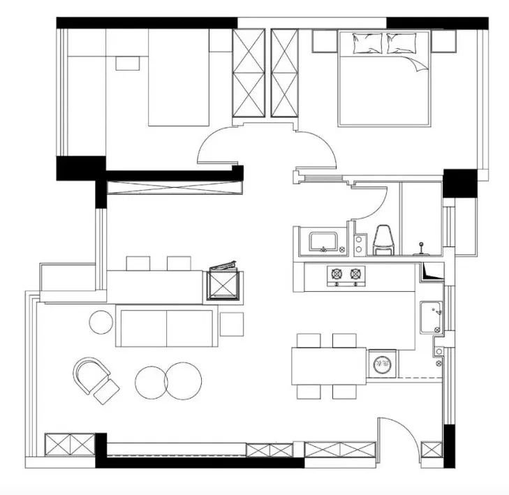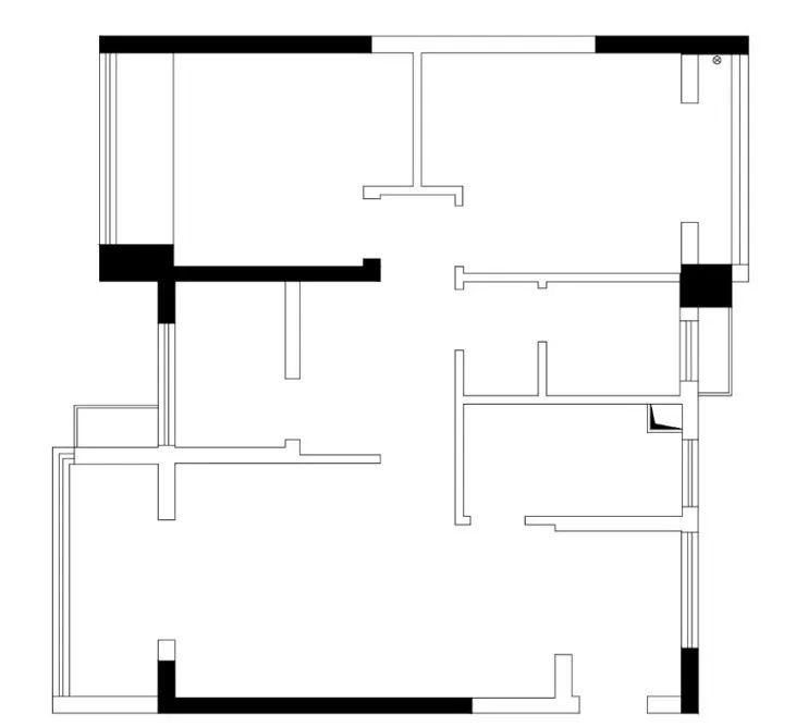 ▲通过原始结构图可见,户型格局很不好,每个空间也都显得非常的小,所以设计师把很多不需要的墙体拆除,多个空间相融合,及厨房,餐厅,客厅及书房打造出一个自由开放的空间,不仅采光上更好了,而且让家人之间的互动性更强。