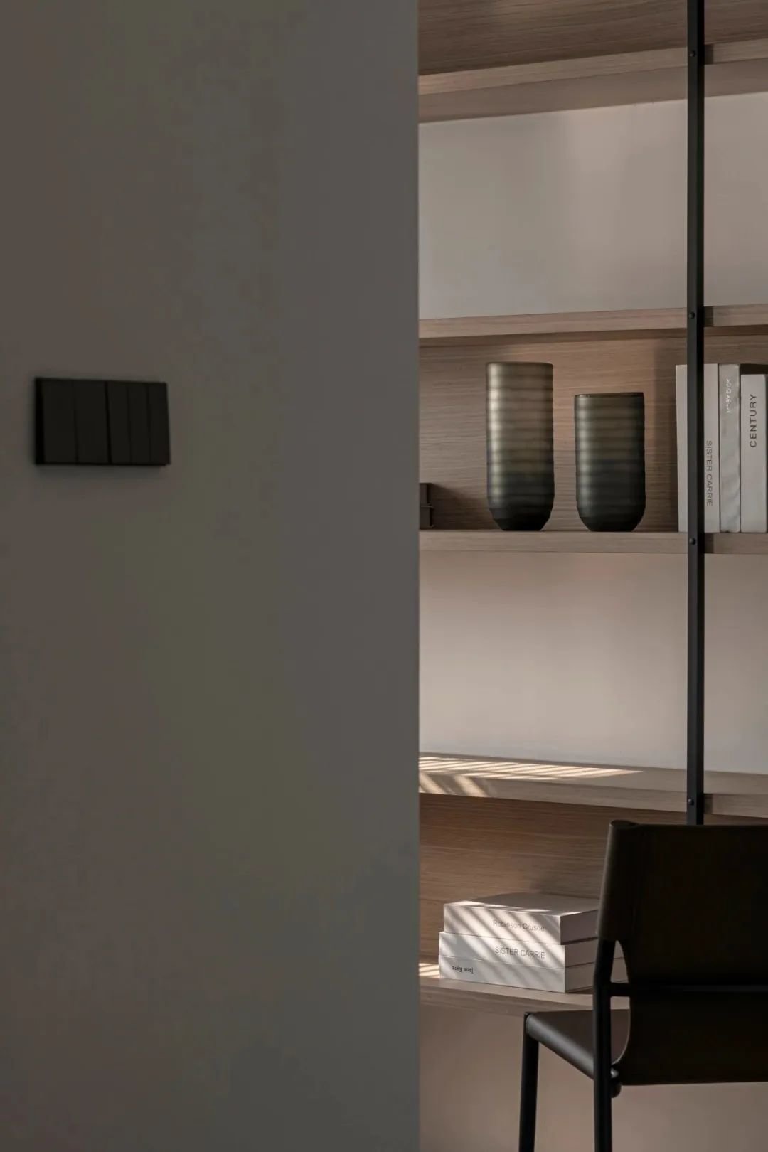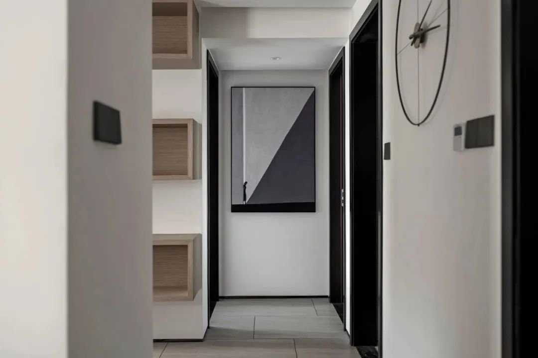 ▲在过道的尽头,一幅黑白灰色的挂画被巧妙地悬挂在墙上,与门套的颜色完美地融合在一起,为整个空间增添了一份优雅和高贵。