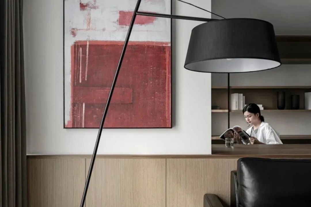 ▲坐在沙发上,右侧挂着一幅抽象画,它像一道烈日照耀在宁静的空气中,散发出温热的余晖。画面上的火红色调和抽象的线条交织成了一幅独特而美丽的画作,仿佛在向人们传递着某种神秘的信息。
