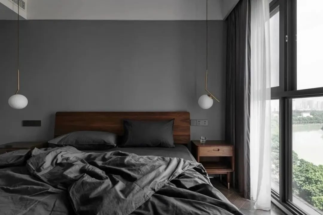 ▲卧室的窗外是一片壮丽的河景,胡桃木床头柜与灰色床品相互映衬,交织出一种温柔而不失质感的美感。这样的设计让我感到舒适自在,同时也不失品味和格调。