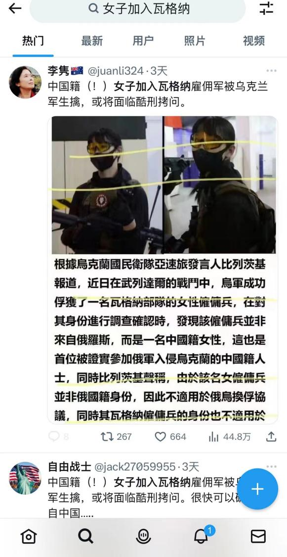 长江云新闻记者找到了这篇外网推文,乍一看像模像样,文中是这样描述的:“根据乌克兰国民卫队亚速旅发言人的报道,乌军成功俘获了一名瓦格纳部队的女性雇佣兵。原以为是俄罗斯人,审完才知道是中国籍,这也是首位被确认参加俄军入侵乌克兰的中国籍人士,接下来等待她的,将是乌军严厉的残酷拷问。”值得注意的是,该推文的标题,前三个字就着重突出“中国籍”,后面还打着一个感叹号。