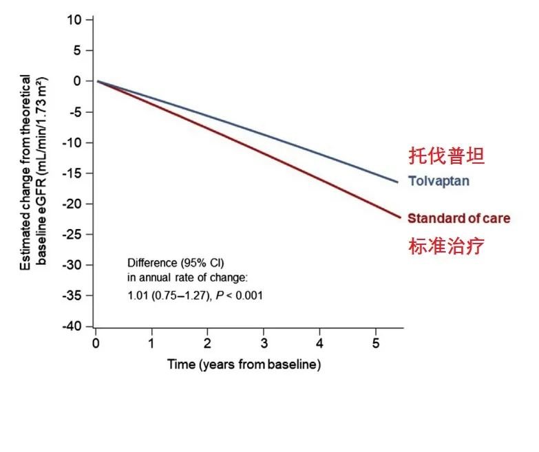 统计结果显示:在5年多的随访中,与传统标准治疗相比,托伐普坦组肾功能下降的速度更缓慢,大约每年可减少1ml/min/1.73m2的下降,按百分比算则是大约降低了25%的下降速度。