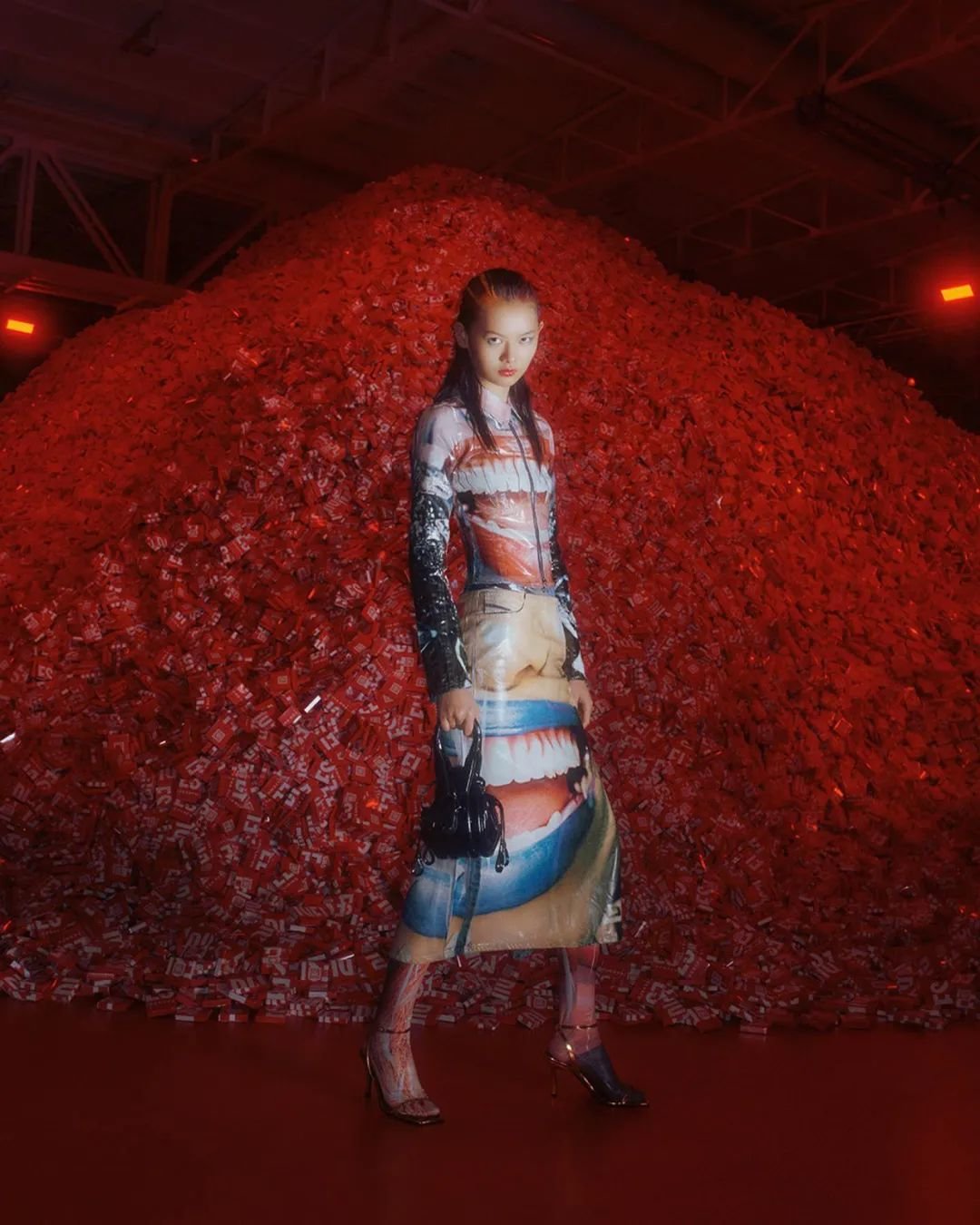 而品牌也转型,这一季的风格非常具有实验性,印花和色彩更加大胆和多层次,裙子的设计加入了脸部特写图案,格外前卫和突破。白牙红唇的超现实印花,搭配光滑闪亮的材质,以极具未来科技感的简约直筒版型呈现。