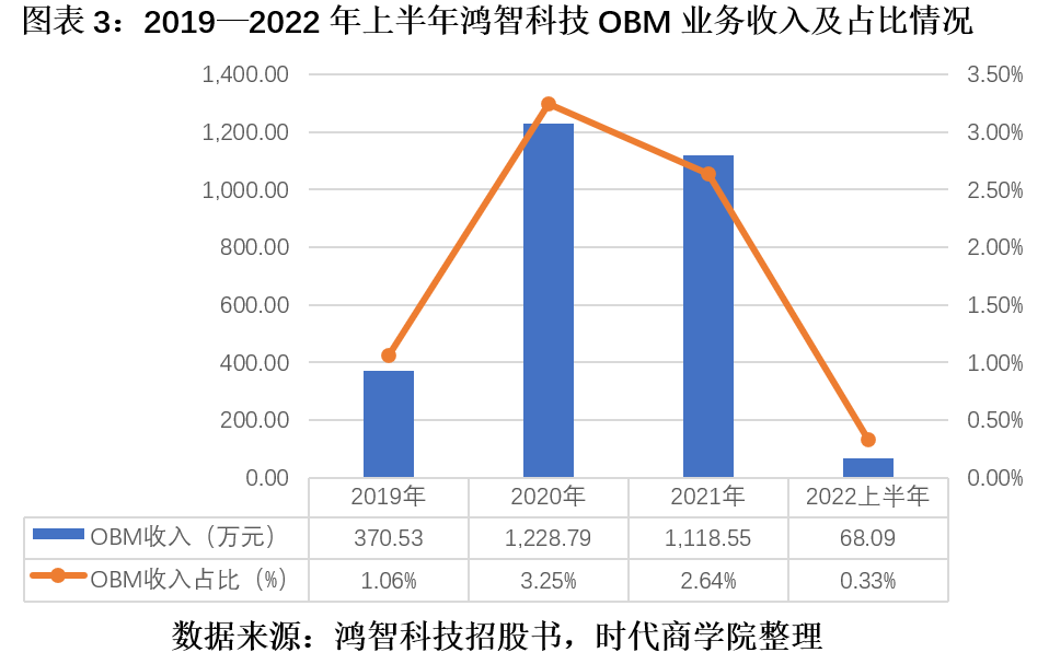 如图表3所示,2019—2022年上半年,鸿智科技OBM模式的营收分别为370.53万元、1228.79万元、1118.55万元、68.09万元,占当期总营收的比例分别为1.06%、3.25%、2.64%、0.33%。