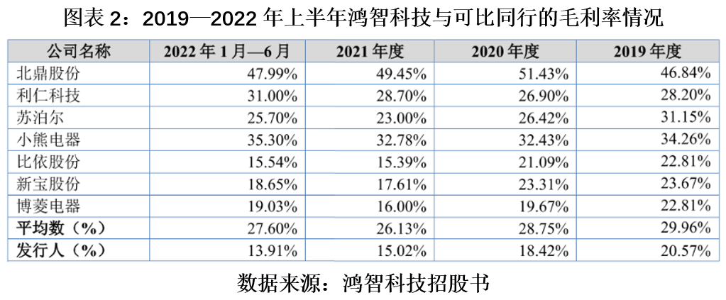 如图表2所示,报告期各期,鸿智科技的毛利率相比可比同行平均值低了约10个百分点。