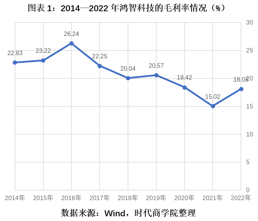 如图表1所示,2016—2021年,鸿智科技的毛利率由26.24%逐步下降到15.02%,下滑了11.22个百分点。虽然2022年该公司毛利率有所回升,但仍没有回到2020年的水平。