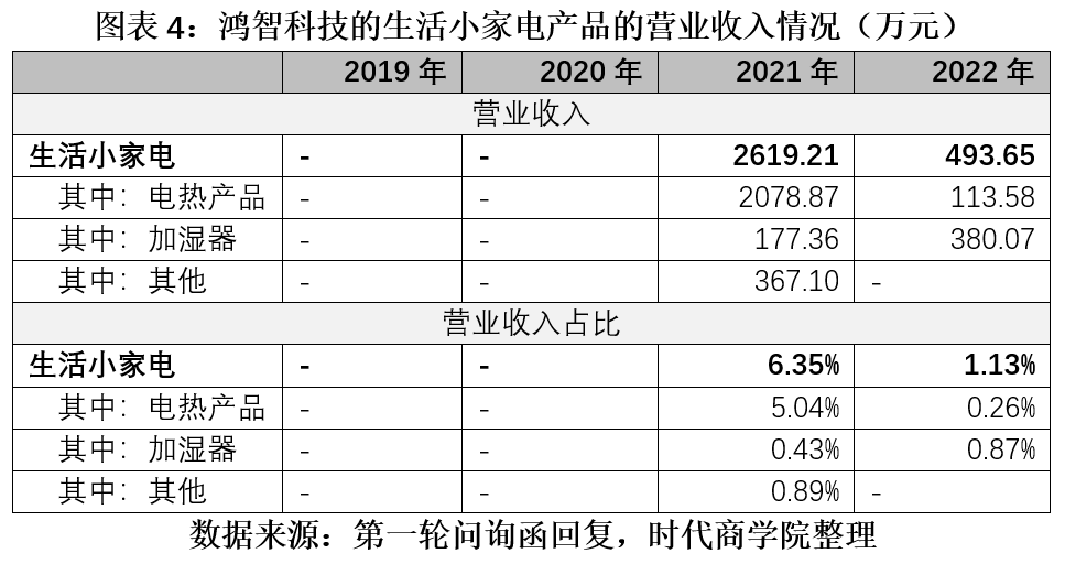 然而,如图表4所示,2021年、2022年,鸿智科技生活小家电业务的营业收入分别为2619.21万元、493.65万元,明显减少;同期生活小家电业务的营业收入占总营收的比例分别为6.35%、1.13%,也明显减少。