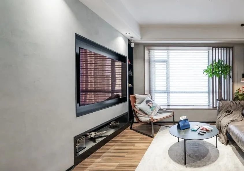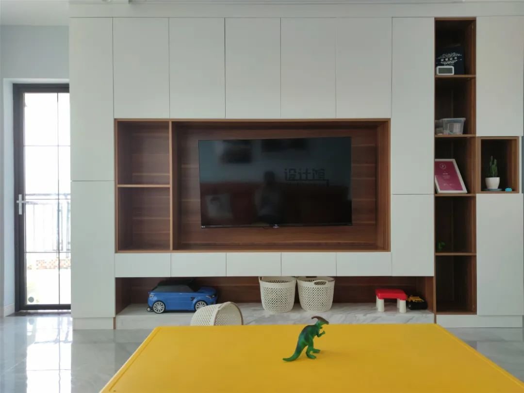 当然,客厅宽度较小的话,电视柜深度可以适当做小些,毕竟电视墙收纳的物品是不限定的,有些大件物品放不下就可以放在餐边柜等位置。电视柜采取定制设计,深度最小可以做到大概12cm——电机厚度大概7cm+支架厚度约5cm。