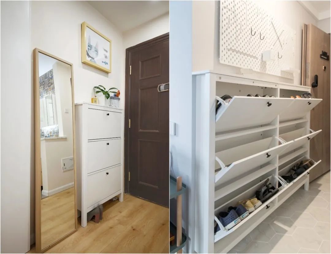 鞋柜如果太深的话,就会出现开头我给粉丝解答那般的情况,放进去的鞋柜,想要找出来就比较困难;但若是玄关宽度不大,鞋柜只能做浅的话,可以在保证过道有80cm的基础,采取翻斗柜鞋柜、鞋子横向摆放等薄鞋柜设计。