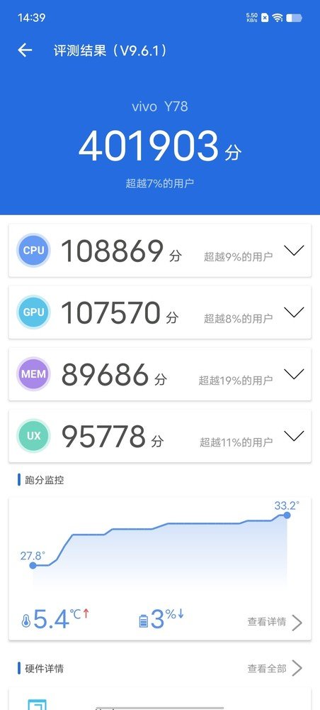 低功耗的芯片还带来了另一大优势,就是发热量低。运行一盘《王者荣耀》后,vivo Y78的背板温度仅为34.1摄氏度,并没有明显发热的现象。另外通过跑分来看,vivo Y78所搭载的天玑7020,在安兔兔跑分中获得了40万分的成绩,这同样符合我们对于这款芯片的预期。