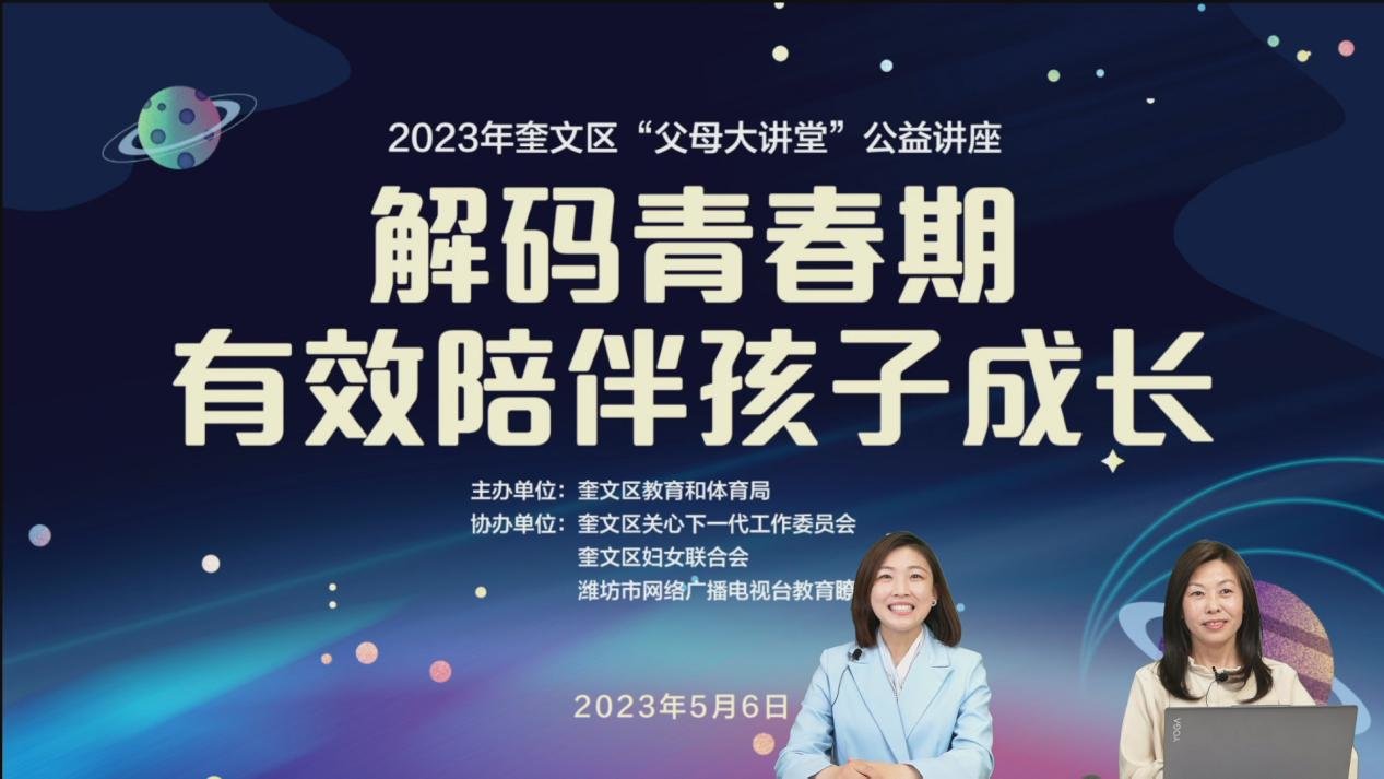 近日,潍坊市奎文区教体局发挥专家资源优势,举办了“父母大讲堂”教育惠民线上公益讲座,邀请姜秋苹老师为学生家长做了《解码青春期,有效陪伴孩子成长》专题讲座。