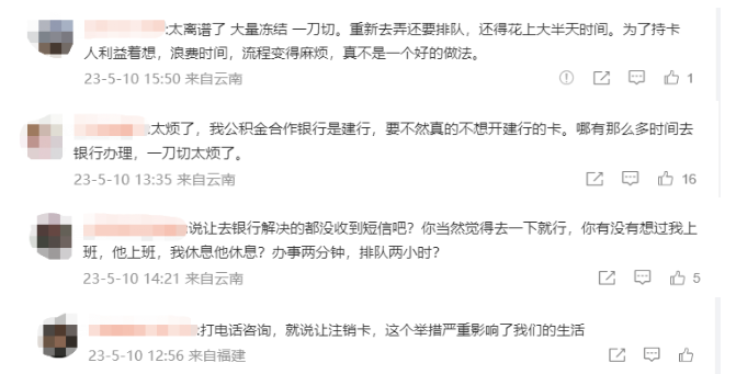 还有储户表示,“解冻”手续繁杂,带来极大不便,“让我去网点解冻,但我们也要正常上班的啊,哪里有时间去网点”“我在深圳办的卡,现在人都不在深圳了,难不成还要回去解冻啊”。