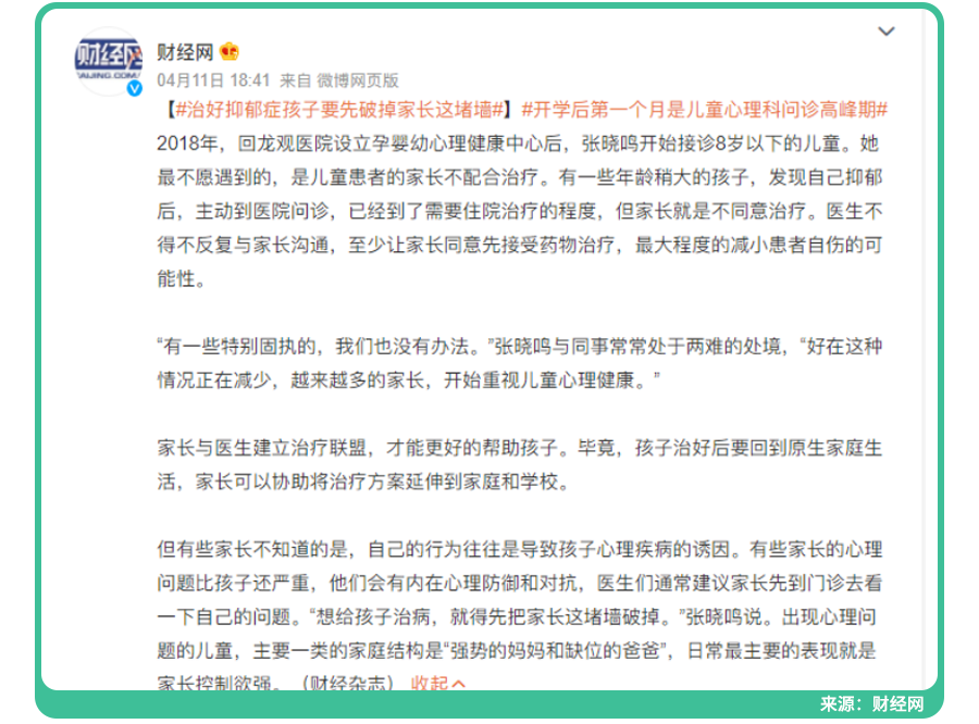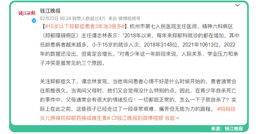 之前有个热搜话题是#15岁以下抑郁症患者3年涨3倍多#。