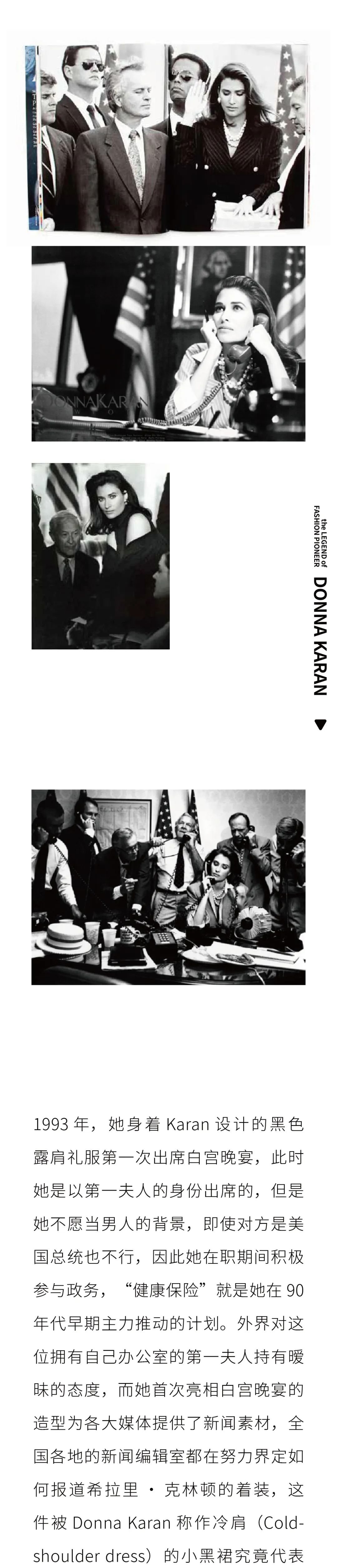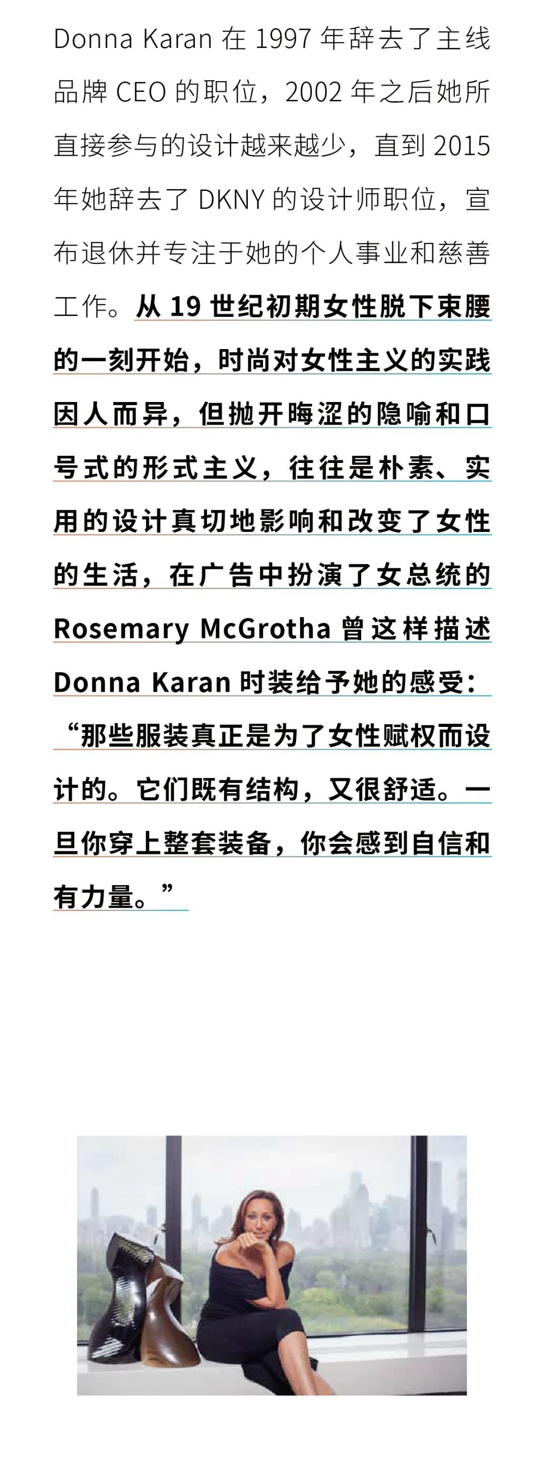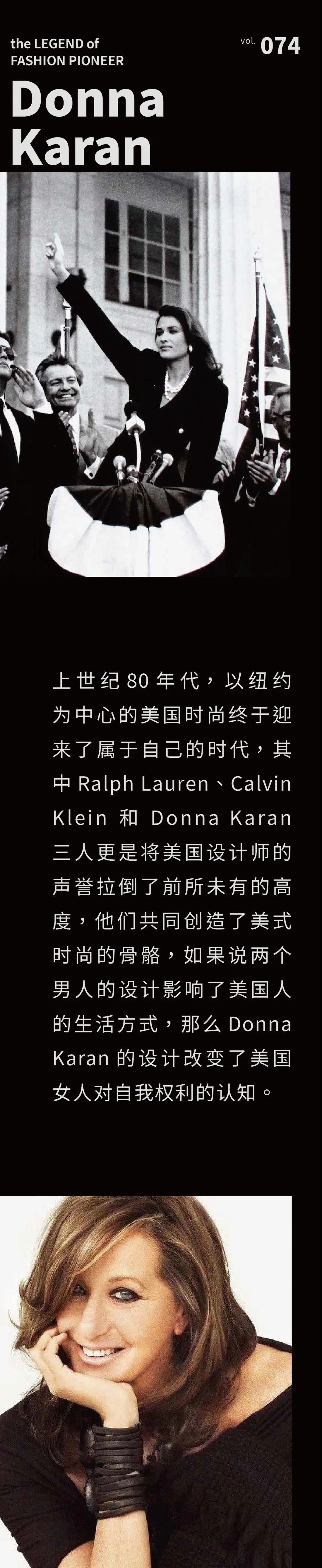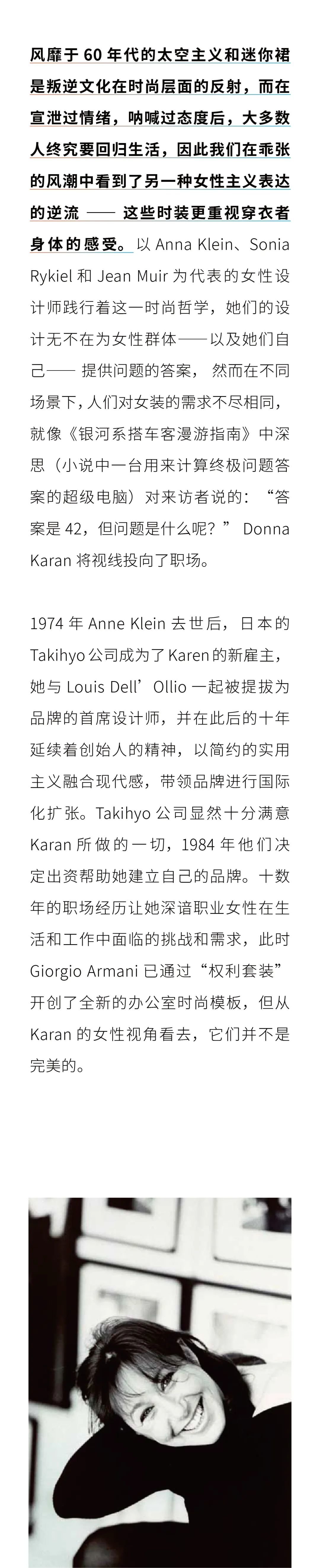 Donna Karan 生于 1948 年的纽约皇后区,她的母亲 Helen Faske 是一位时装模特,父亲 Gabriel Faske 则是名裁缝,因此她的时尚启蒙可能从降生的那一刻起便开始了。Karan 的时尚生涯没有经历太多波折,她在高中毕业后就进入了帕森斯设计学院,大学在读期间就被著名设计师 Anna Klein 聘为设计助理,并在 1971 年正式加入 Klein 的设计团队。Anna Klein 是当时行业内备受尊敬的女性设计师之一, 在性别平等意识淡薄的年代,Klein 就以最朴实的方式践行着女性主义,利用相对宽松的剪裁、简约大方的廓形和优质舒适的面料打造实用且得体的女装。随着越来越多的美国女性选 择步入职场,兼备多重属性的 Klein 女装毫不意外地成为了成衣市场的宠儿,设计师也在 60 年代后期成为美国家喻户晓的时尚名人。而对于年轻的 Donna Karan 来说,Klein 扮演着雇主和导师的双重角色,在后者的启发下,她对女装的审视同样跳脱出了男性凝视的框架,将焦点落在更具现实意义的东西上——实用性。