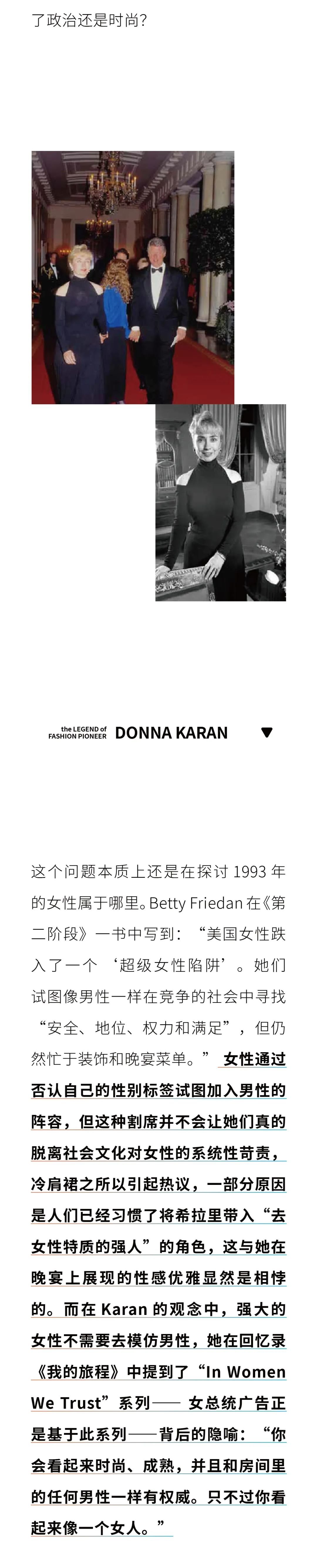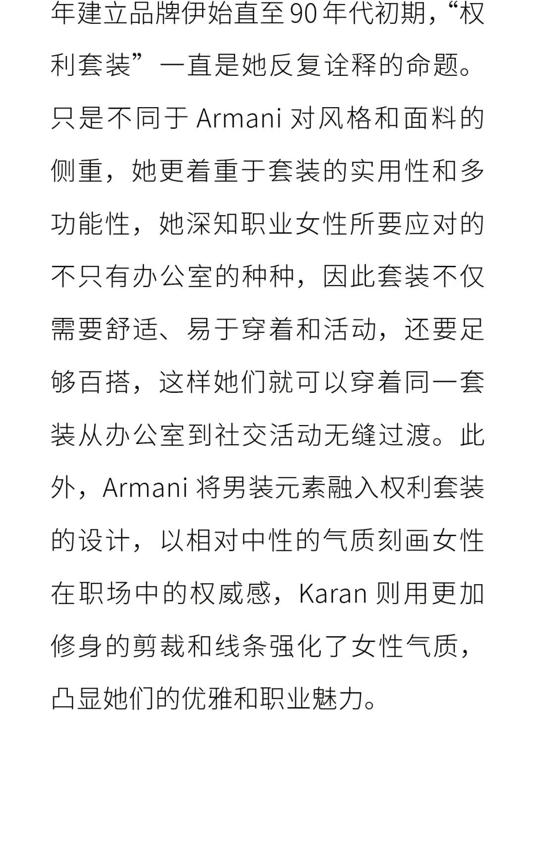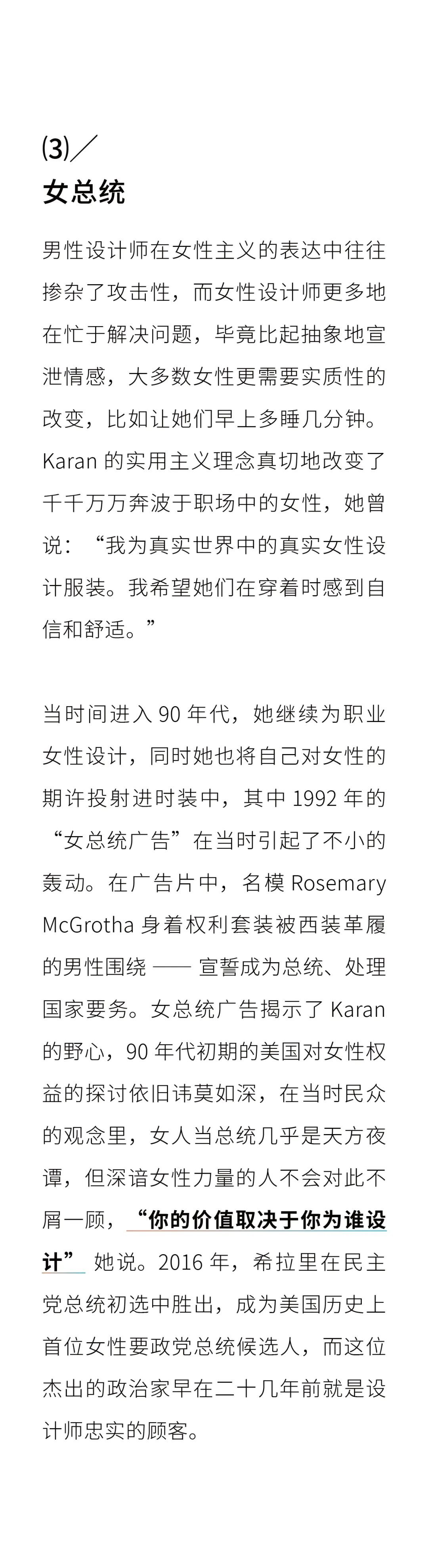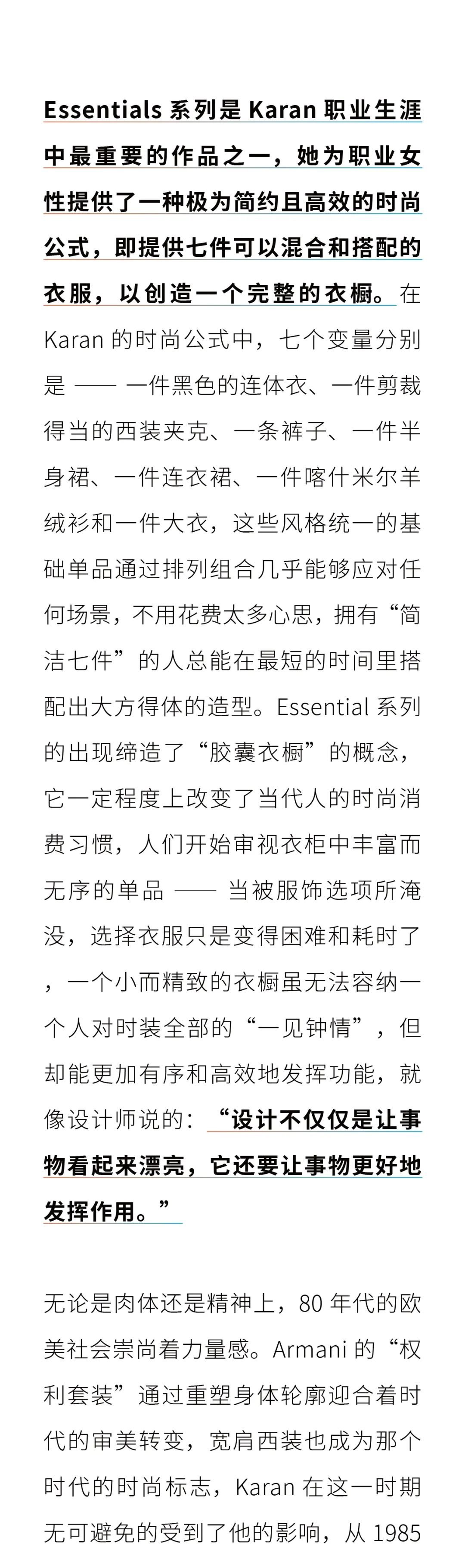 职业女性的困境是什么呢?Karan 认为在“话语权缺失”之外还有“时间的缺失”。八小时工作制挤压着每个人的私生活,但相比于男性简短的晨间梳洗,女性花在打扮上的时间要长得多,这也意味着她们不得不因此牺牲睡眠。而“今天穿什么”更是个恒久难题,这在男人眼中或许小题大做,但规则制定者们当然不会看到那副以 “美”为名,套在女人身上的隐形枷锁。Karan 不是社会活动家,她只能以设计之力去缩短职业女性选择穿搭的时间,“简洁七件”理念就为此而生。