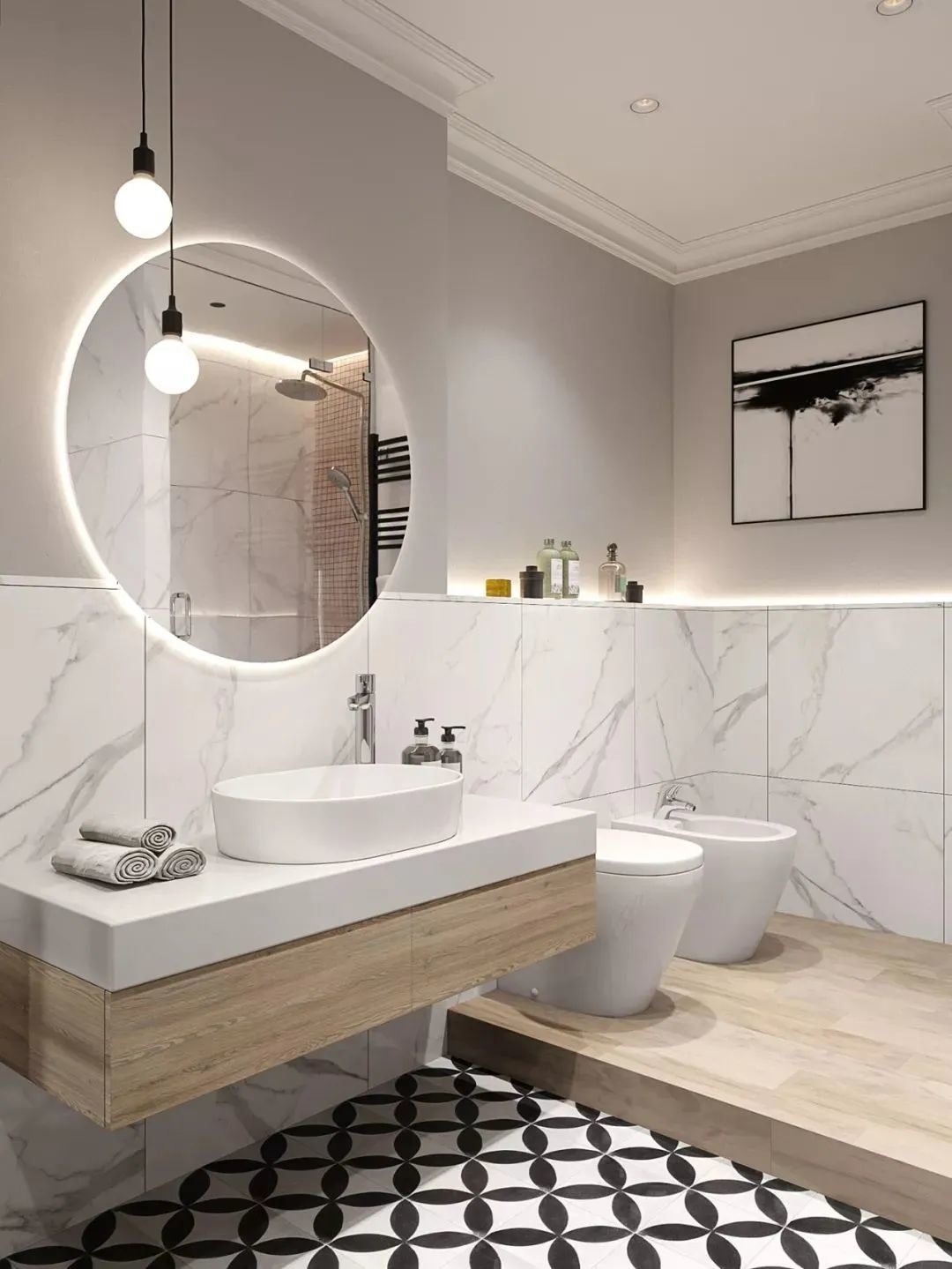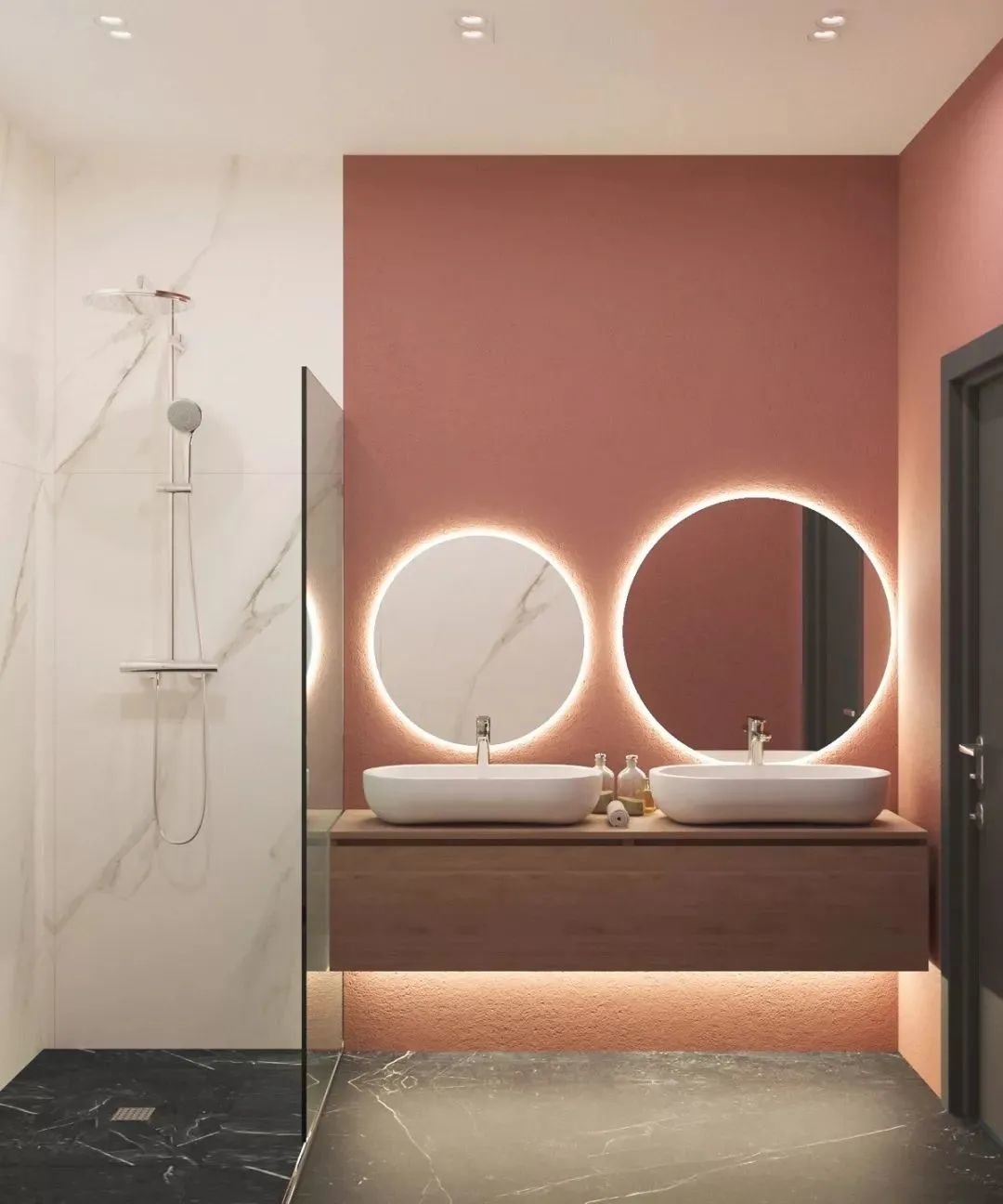比如洗漱区的灯光、马桶区域的灯光、沐浴区的灯光,适当安装灯源,这样可实现主光源和辅光源的相互配合,既有层次感又明亮。