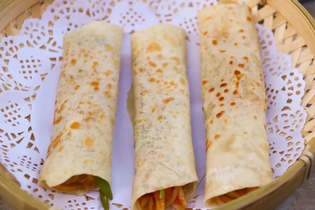 薄薄的饼卷上热乎乎的小菜,咬一大口进嘴里,咀嚼时食材和面饼的味道在口腔里扩散开,别提有多香了,一口接一口,能接连吃上好几个。