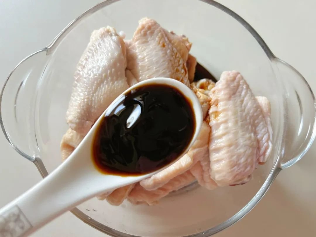 鸡翅用牙签扎孔,加入料酒和生抽