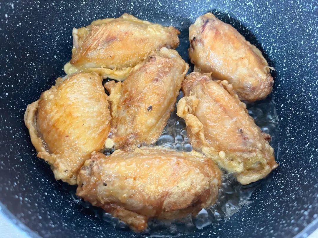 不粘锅里多放点油,把鸡翅煎到两面金黄