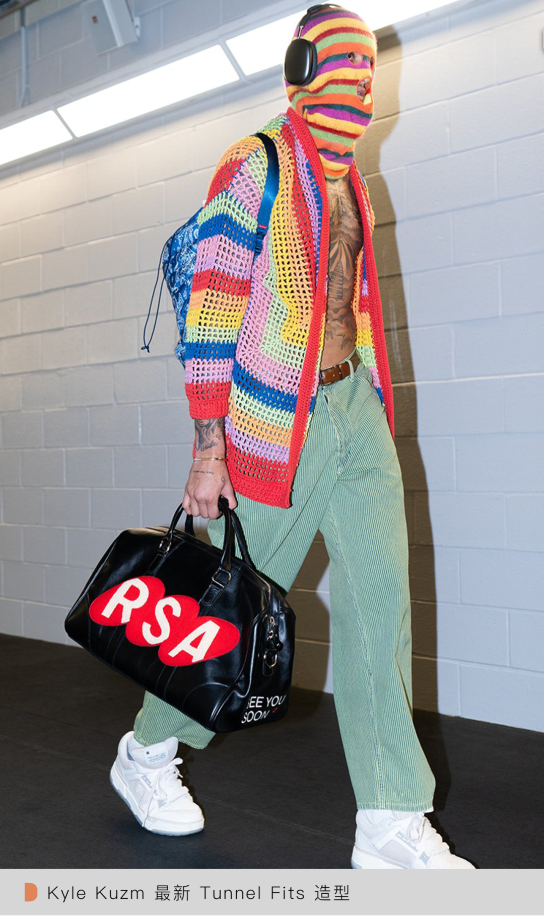 在风格的另一端,Kyle Kuzma 和 Torrey Craig 通过前卫的造型引起了业界讨论。今年 Kuzma 的造型再次让观众颠覆印象;比如他这次身穿彩虹针织开衫来搭配 Marni 巴拉克拉法帽,以及穿着超大号 Rick Owens 羽绒服和紧身裤,都使得他迅速走红。