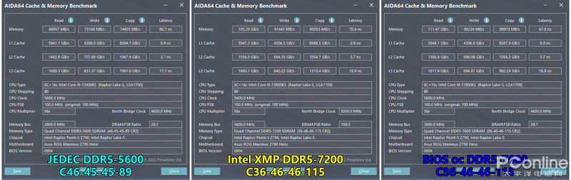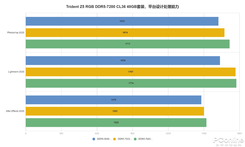 对比性能测试中,我们随了拿Trident Z5 RGB 幻锋戟 DDR5-7200 CL36 48GB内存套装的JEDEC起始频率DDR5-5600 C46与XMP频率DDR5-7200 CL36作对比外,还加入了我们手动起步上去的DDR5-7600 CL36进行三个不同频率的性能对比。