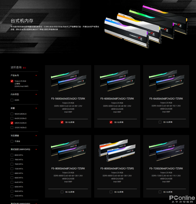 芝奇 Trident Z5 RGB 幻锋戟 DDR5 48GB (2x24GB)套装产品提供了较为丰富的频率选择,包括:DDR5-5600 CL40、DDR5-6000 CL40、DDR5-6400 CL40、DDR5-7200 CL36,以及DDR5-8000 CL40等,同时还有黑银两种不同的配色可供选择。