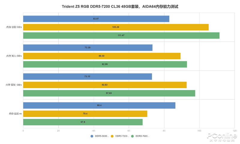 可看到随着频率的提升,时序缩小,Trident Z5 RGB 幻锋戟 DDR5-7200 CL36 48GB内存套装的理论性能有着较大的提升。尤其是从JEDEC频率提升到XMP频率后的性能提升最为明显,当然在允许的情况下(处理器IMC足够强,内存体质可以)的情况下,频率超高,能为我们带来更好的性能表现。