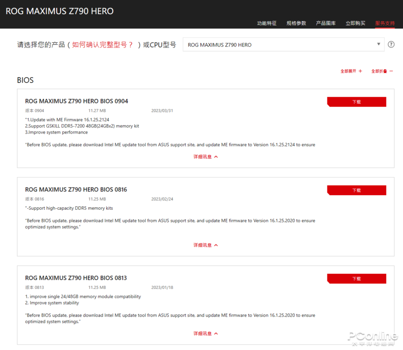 例如,我们测试平台上所使用的ROG MAXIMUS Z790 HERO主板BIOS,直到0813版本的才增加支持24/48GB单条的DDR5内存模块。而来到最新的0904,则是标明支持我们此次测试所使用的Trident Z5 RGB 幻锋戟 DDR5-7200 CL36 48GB内存套装。