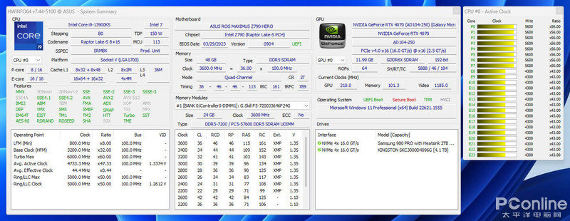 测试平台我们使用上了旗舰级的Intel处理器i9-13900KS,主板为ROG MAXIMUS Z790 HERO,并且更新到最新的0904版本BIOS。而显卡则是RTX 4070 显卡,拿来搭配平台进行性能测试。硬盘自然也是不能组成屏颈的,三星980 PRO 2TB系统盘+金士顿 KC3000 4TB游戏盘的搭配。