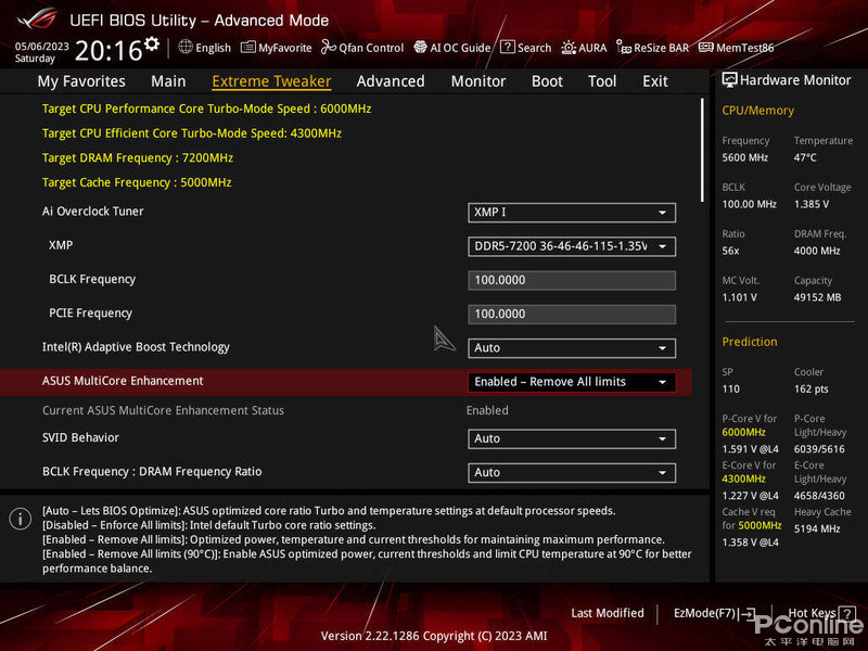而我们测试XMP性能就是直接在BIOS里开启XMPI,然后选择对应的DDR5-7200 C36档,以及DDR5-7200内存频率即可以了。