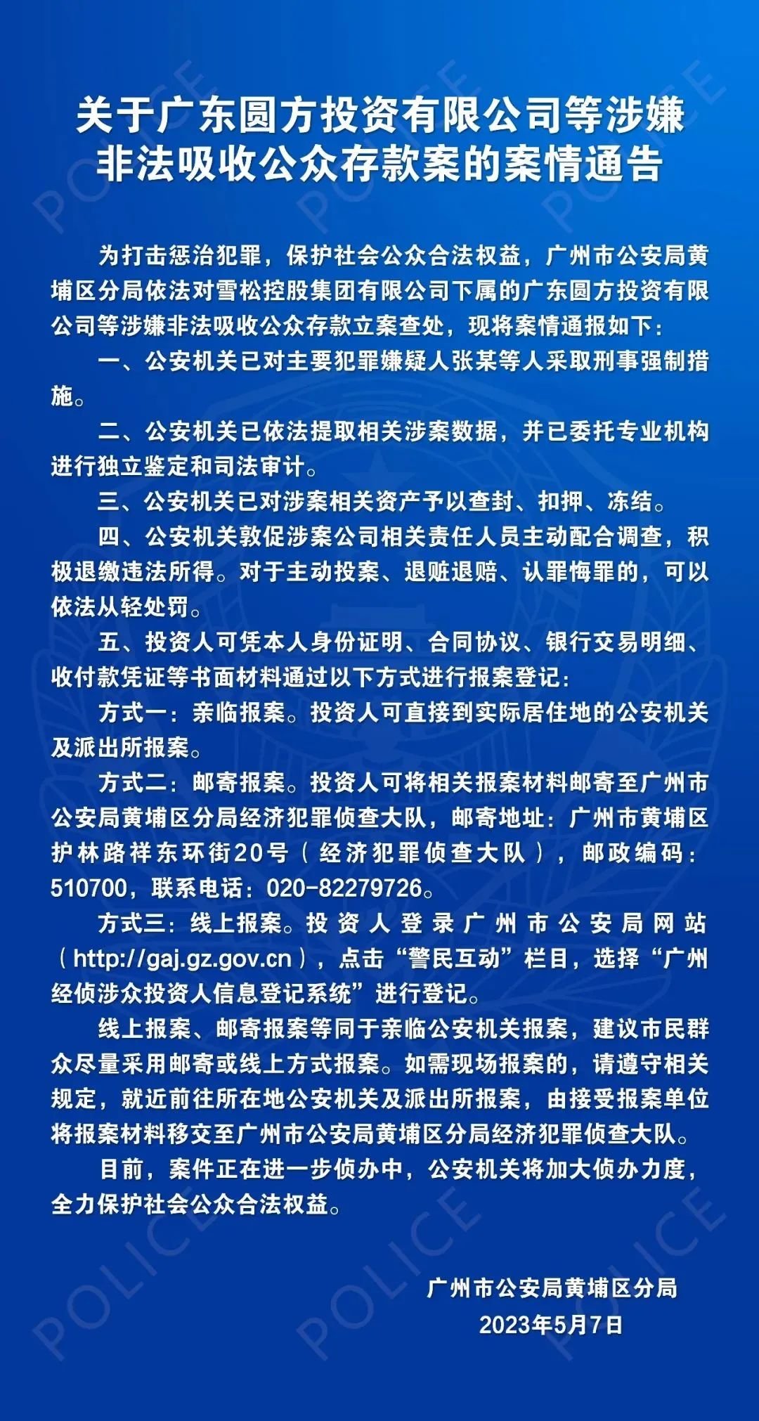 广州市公安局黄埔分局于5月7日公告称,雪松控股集团有限公司下属的广东圆方投资有限公司等,因涉嫌非法吸收公众存款已被立案查处。