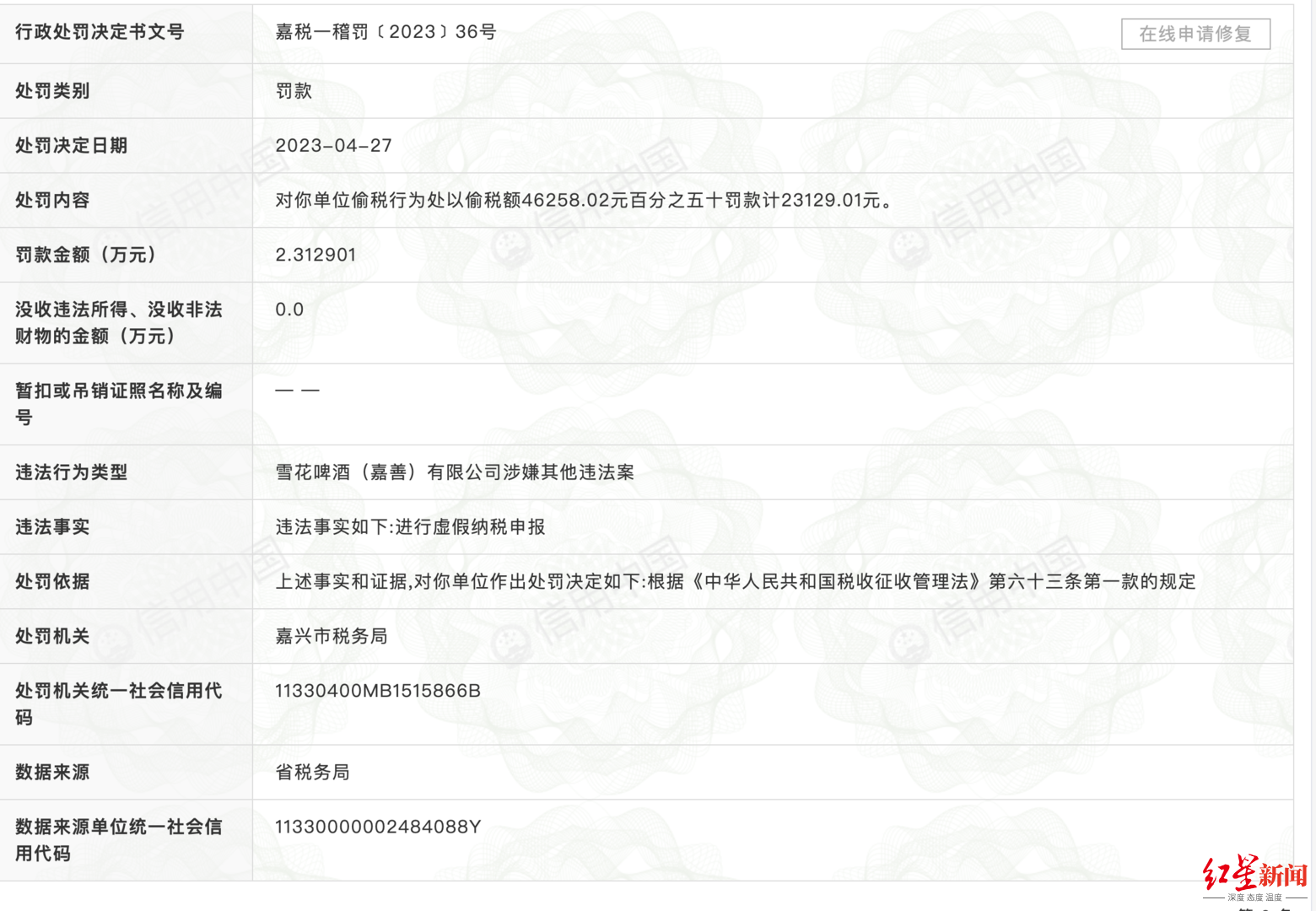 红星资本局5月15日消息,据公开信息,雪花啤酒(嘉善)有限公司因进行虚假纳税申报,被嘉兴市税务局处以偷税额4.6258万元百分之五十罚款计2.3129万元。