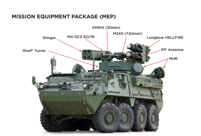 根据美国陆军的说法,M-SHORAD是一种基于史崔克A1战车(双V型外壳)的防空系统,与Ricardo DRS防空任务装备包(MEP)相匹配。MEP的特点是Moog Space&Defense Group的可重构综合武器平台炮塔,结合了现有的火炮、导弹、火箭和传感器。它旨在对无人驾驶飞机系统、旋翼和残余固定翼UAV威胁提供更强的防御。为了增加对小型无人机、迫击炮、炮兵和发射火箭弹药的车辆防御,美国陆军也一直在开发高能激光武器,以补充M-SHORAD系统。