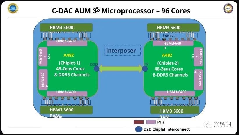 根据最新曝光的资料显示,AUM 的CPU核心采用的是代号为 Zeus 的 Arm Neoverse V1内核,共有 96 个核心,但分为两个小晶片进行封装,每个小晶片包含 48 个 V1 核心,并且每个小芯片都有自己的内存、I/O、C2C/D2D互联、缓存、安全和 MSCP 子系统等,两个小芯片共计包括 96 MB 的二级缓存和 96 MB 的系统内存。两个采用A48Z 的小芯片使用同一中介层上的 D2D 小芯片互连技术连接在一起。