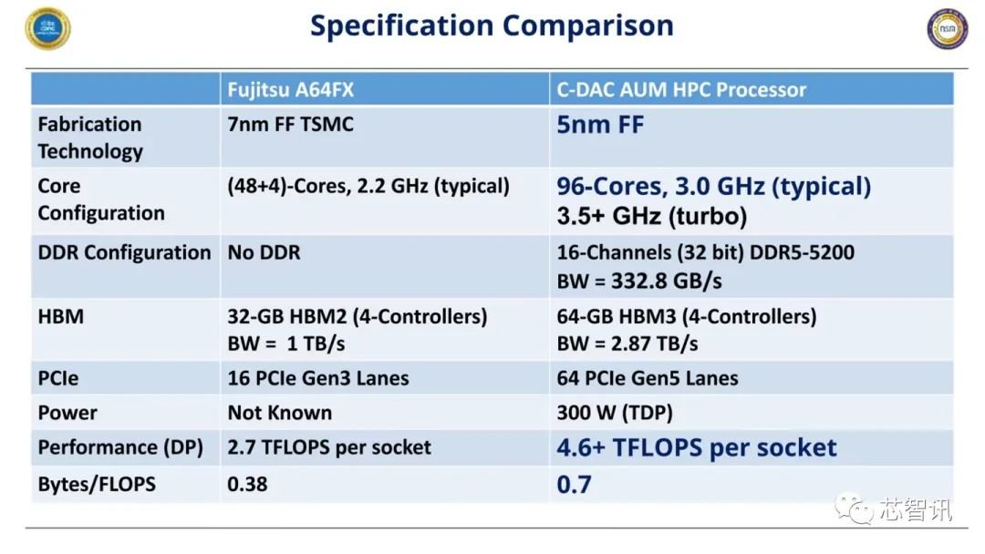 C-DAC还将AUM与富士通的A64FX处理器进行了对比,可以看到,AUM不仅支持更先进,核心数量核主频更高,HBM内存容量翻倍,支持高达64路的PCIe Gen5接口,整体的性能达到了A64FAX的近2倍,TDP为320W。