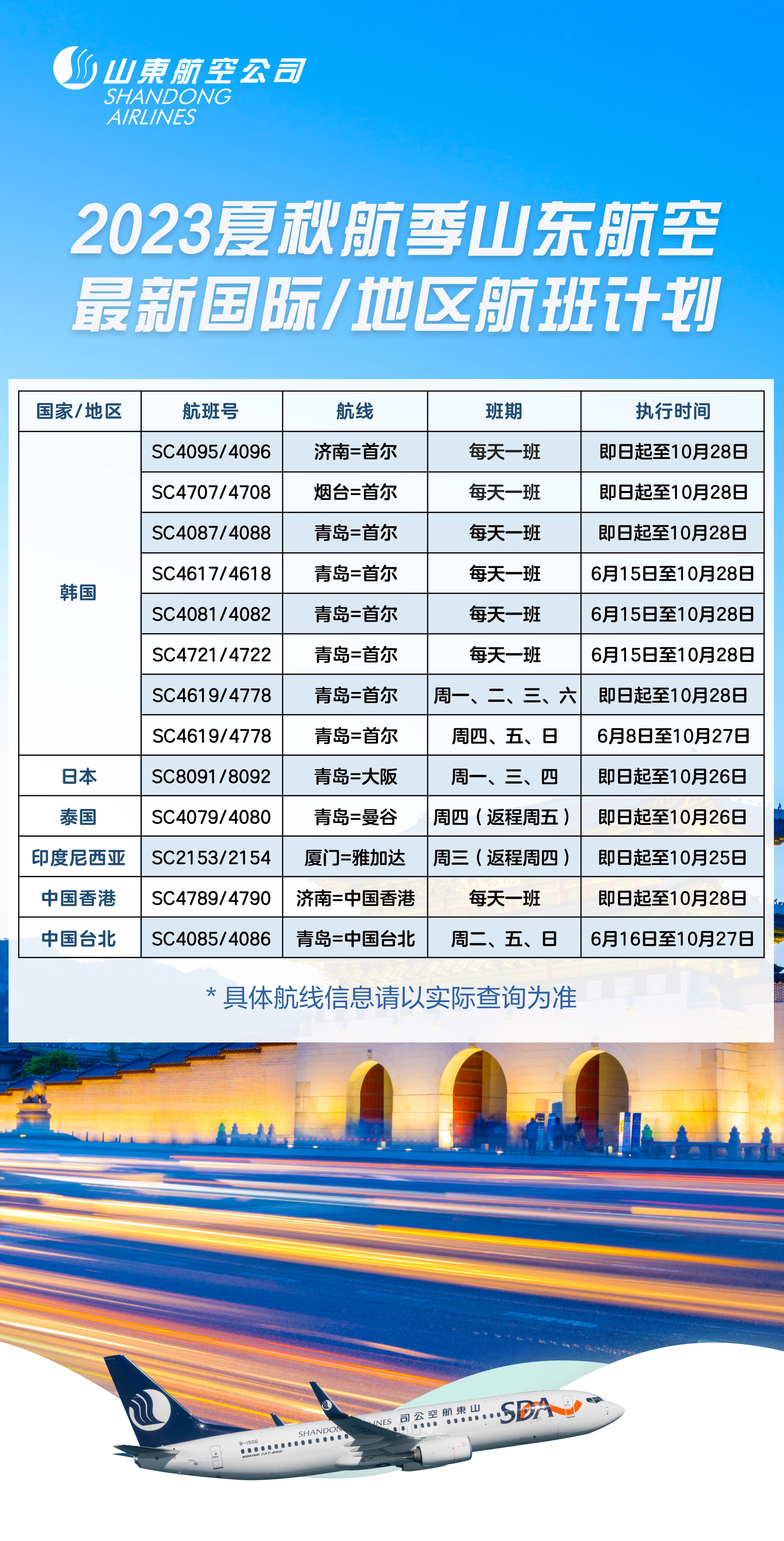 山航提醒广大旅客,提前了解目的地出入境政策,妥善安排行程。如需获取山航最新航线、产品和服务信息,建议关注“山东航空”微信公众号。有购票需求的旅客可通过掌尚飞APP、山航官网、山航微信小程序或拨打山航24小时客服热线95369查询预订。