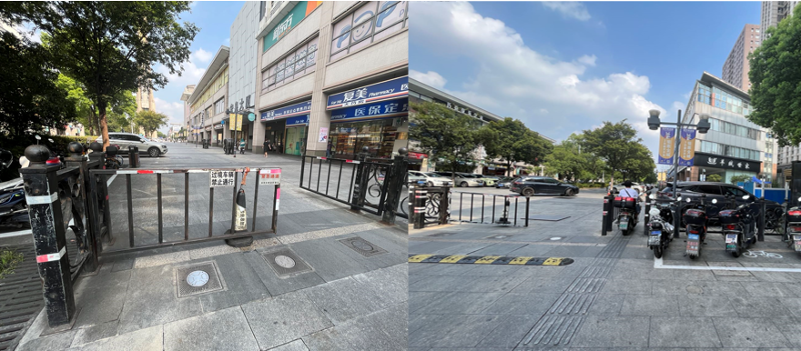改造前的梅川路步行街本是通车的,改造后路两头都设置了关卡,禁止车辆通行