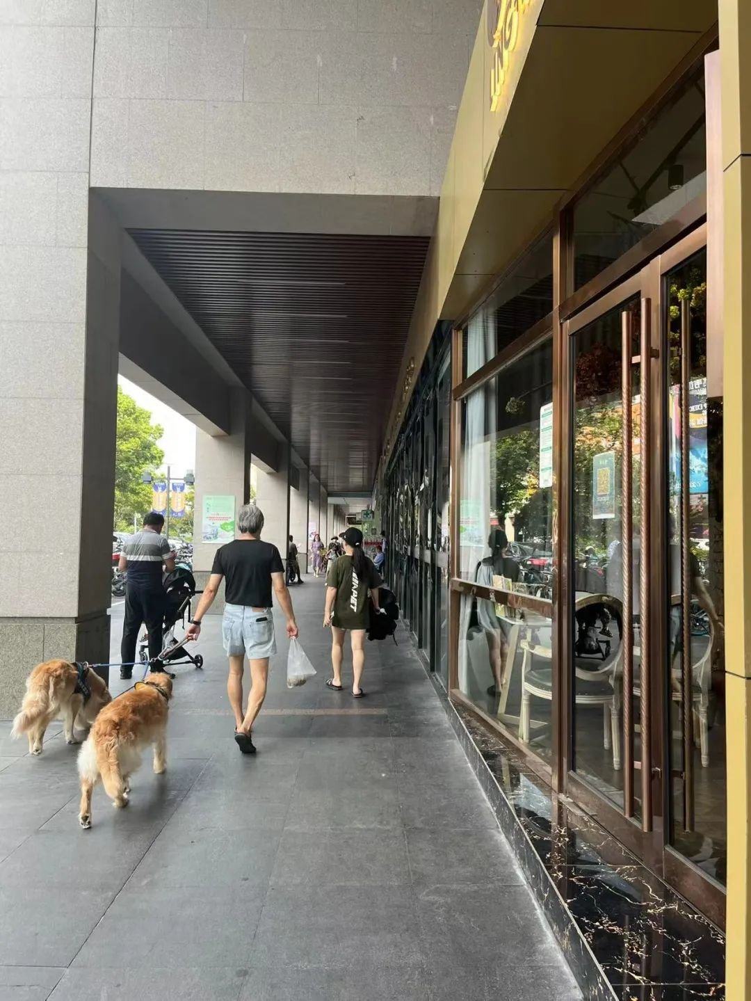 一个主人带着狗子出来溜溜,整条街道上可以自由行走,不用担心危险